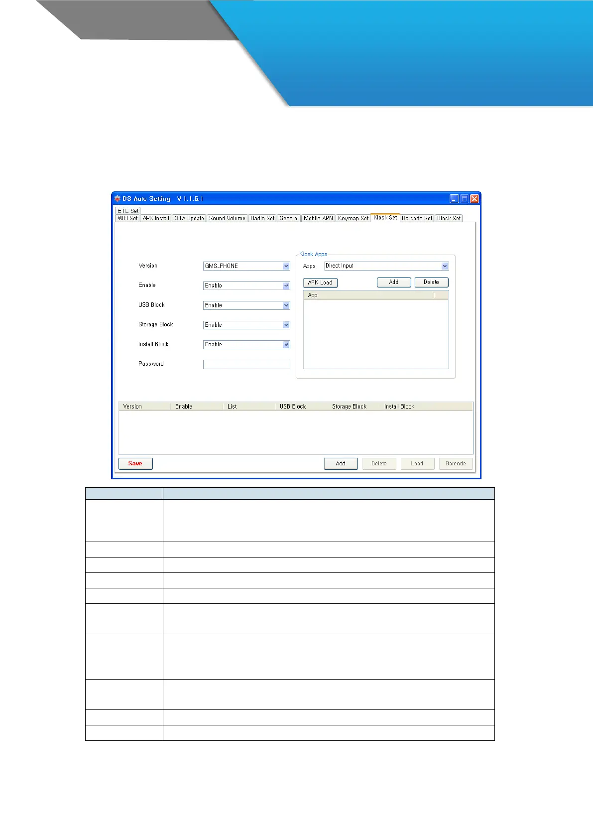 · Delete the selected application from Kiosk app list
