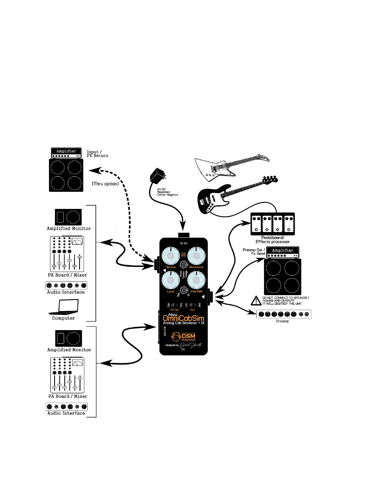 - ¼” Input Jack: Connect here the output from your pedalboard/ amp fx send, or just the
