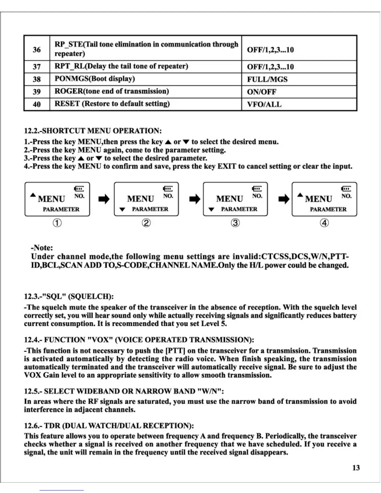 DSP UV-5R - Shortcut Menu Operation; SQL (Squelch); Function VOX (Voice Operated Transmission)