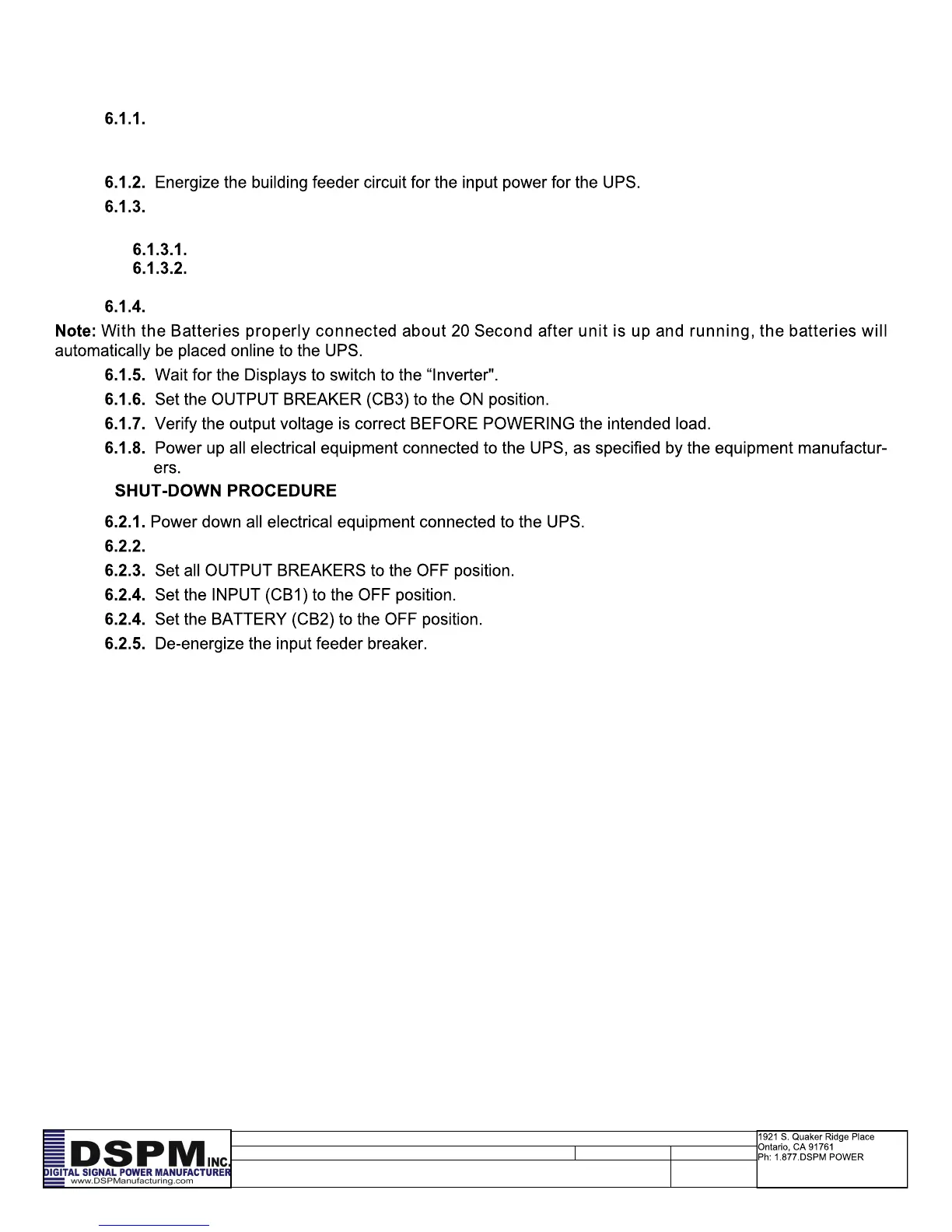 Turn on the DC circuit breaker (CB2). Set the Input Breaker (CB1) to the “ON” position, and verify