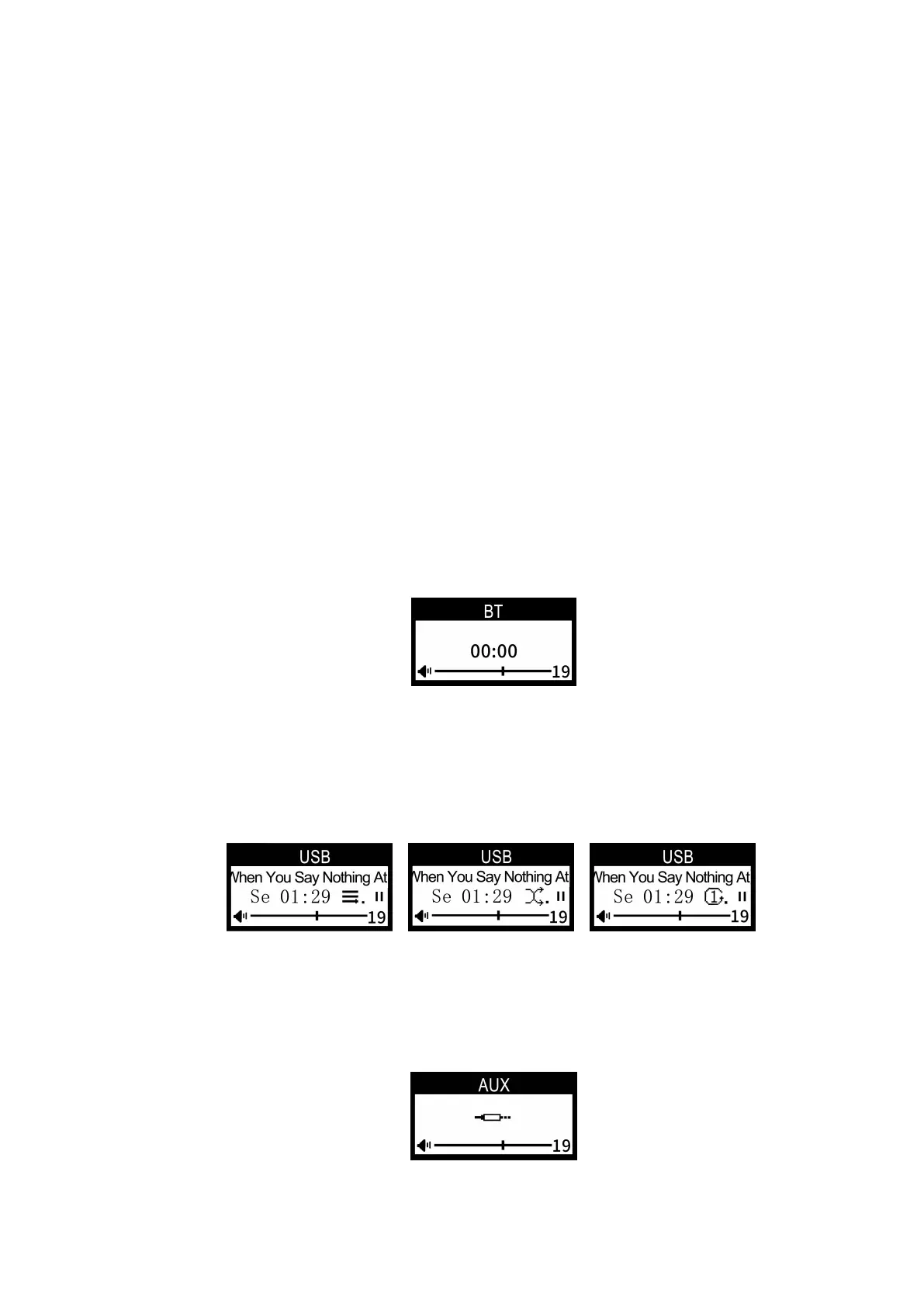 displays the current playing song name, playing duration, playing mode, playing status and volume level. In USB
