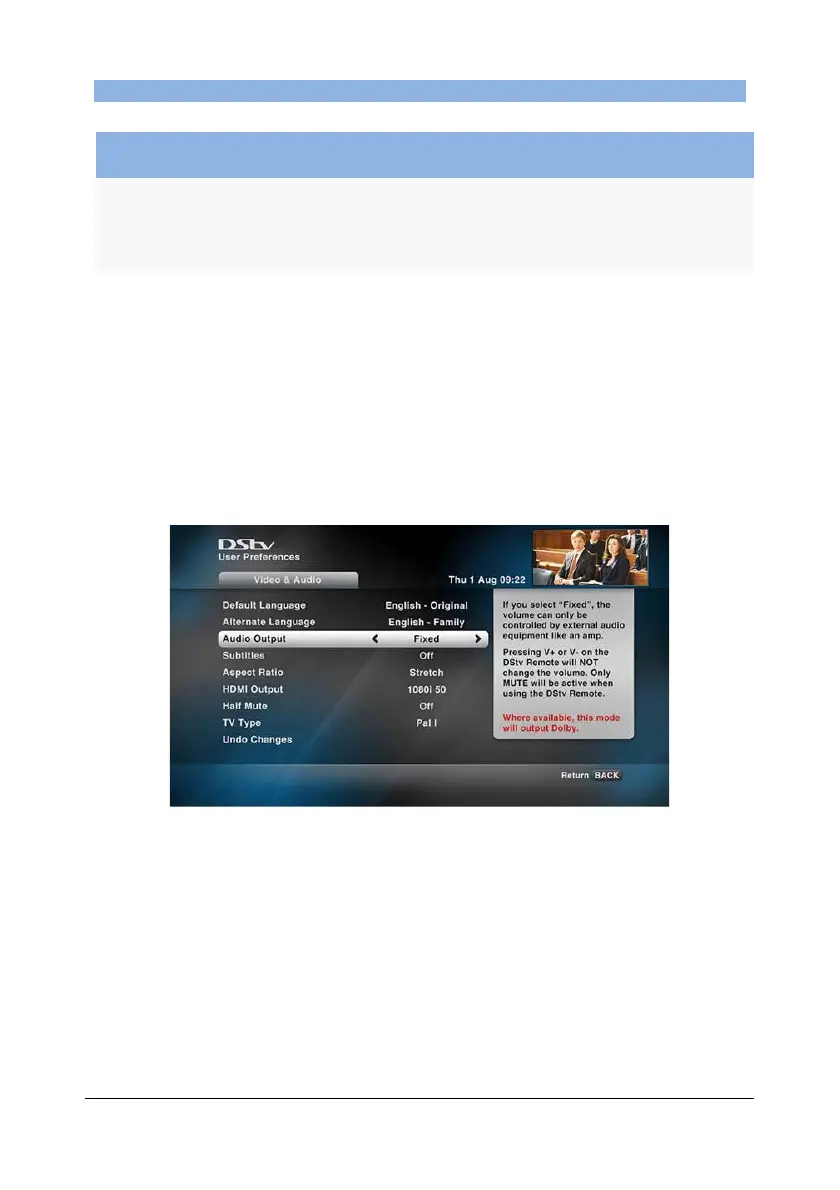 Recommendation: If you have set the DStv Explora to use “Fixed” Audio Output (see