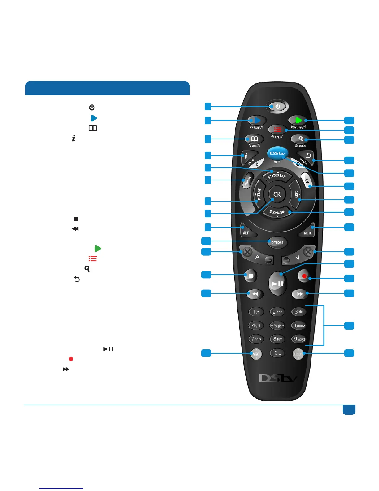 DStv A6 - DStv Remote Button Identification; Core Function Buttons; Navigation and Playback Controls; Number Pad and Special Keys
