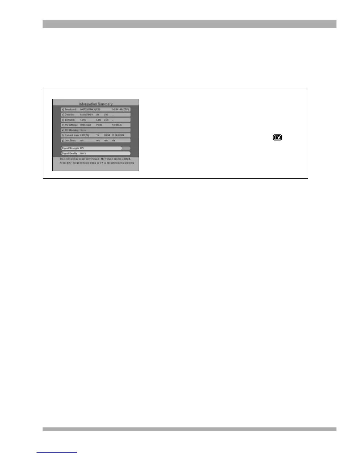 The information screen in the Main Menu provides technical information about your MultiChoice