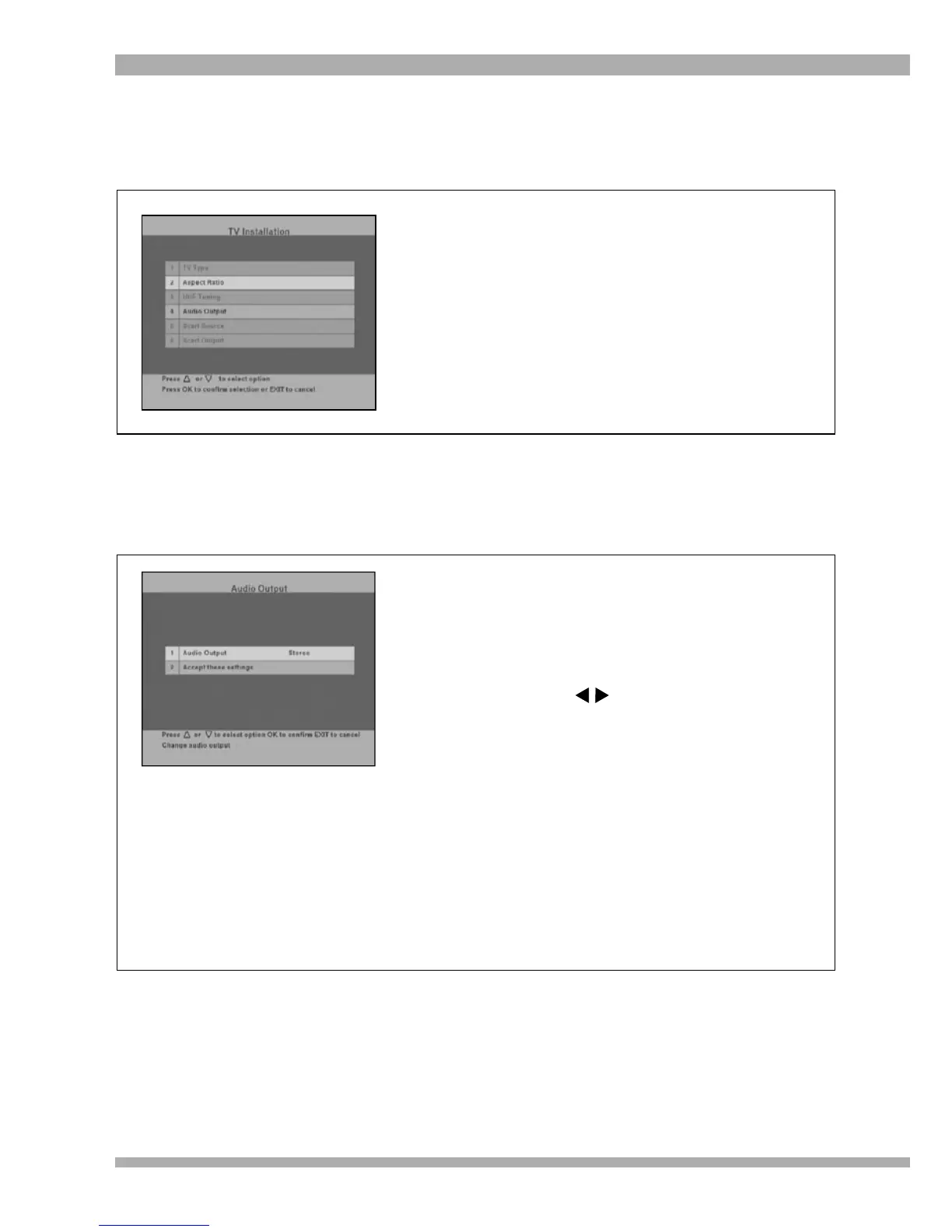 In this menu, you can adjust the Audio Output (stereo or mono). The PIN code for TV