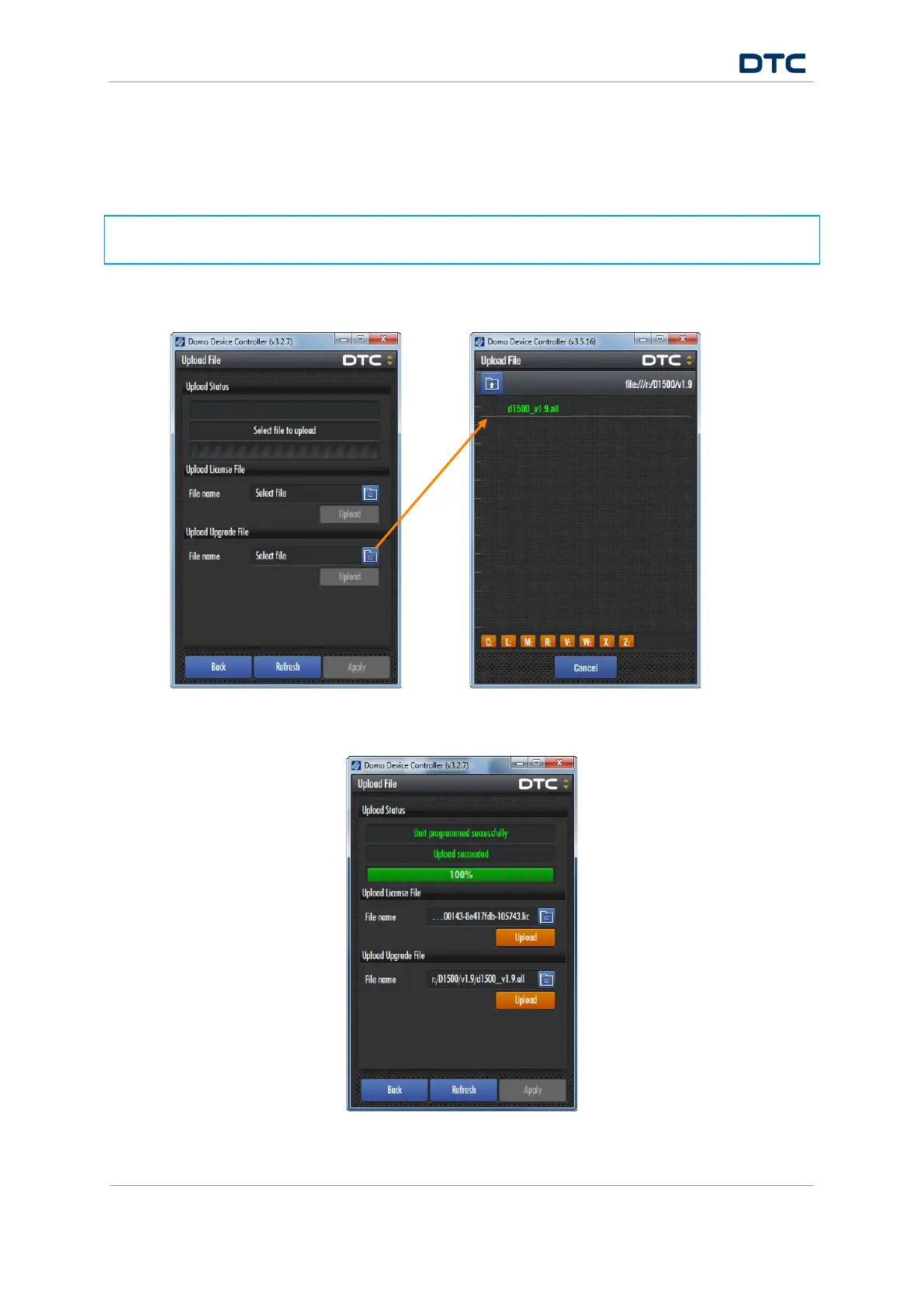 Click the Upload button and note the status on the Device Controller screen. The upload process may take