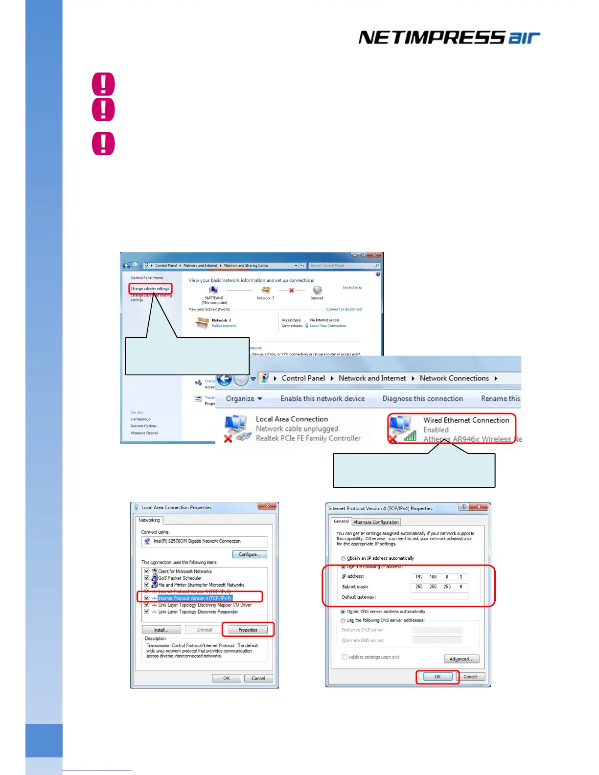 For example, if you set 192.168.0.1 as an IP address of NETIMPRESS air, please set