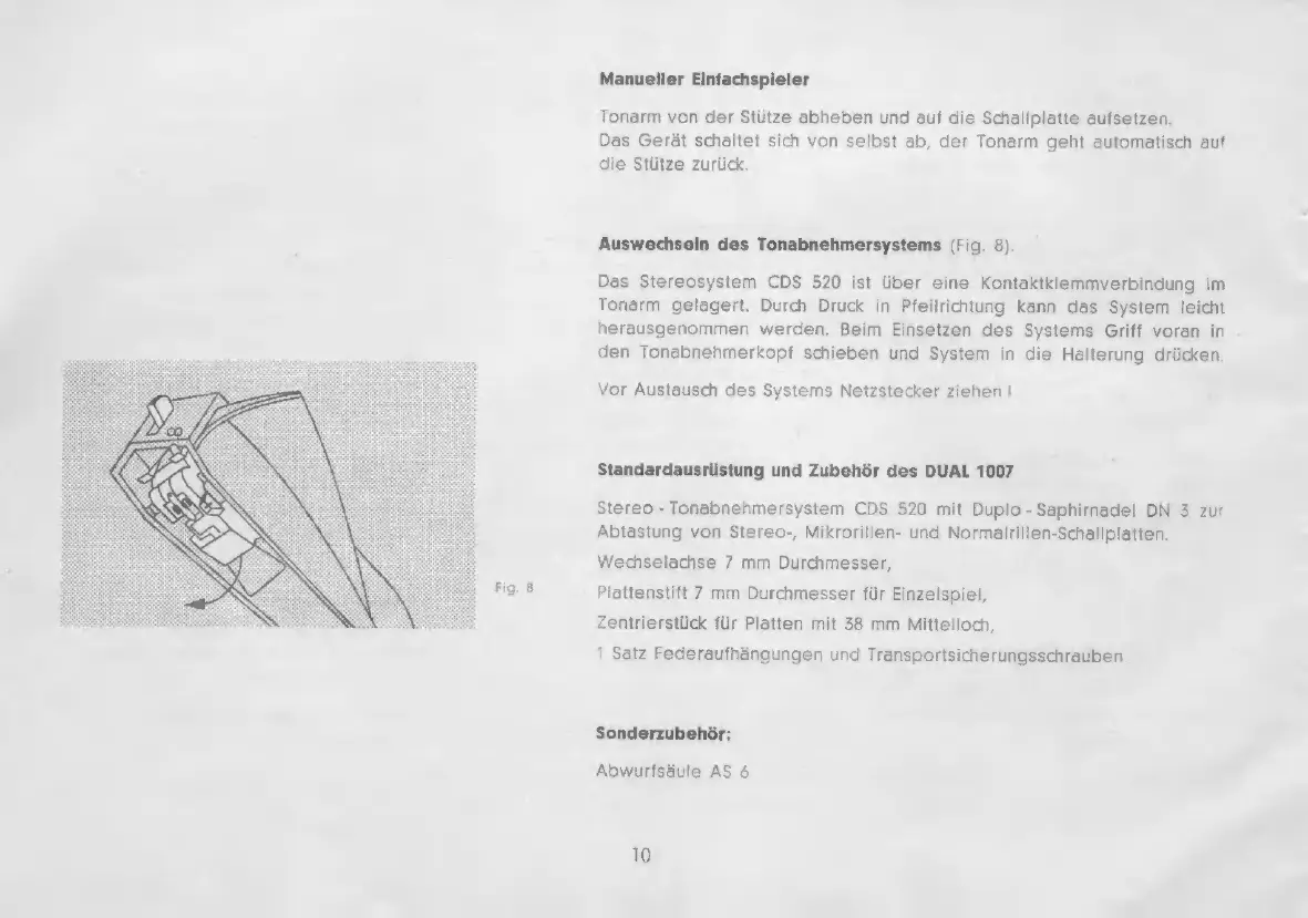 Dual 1007 - Manual Single Player; Replacement of pick-up cartridge; Standard Accessories; Optional Accessory