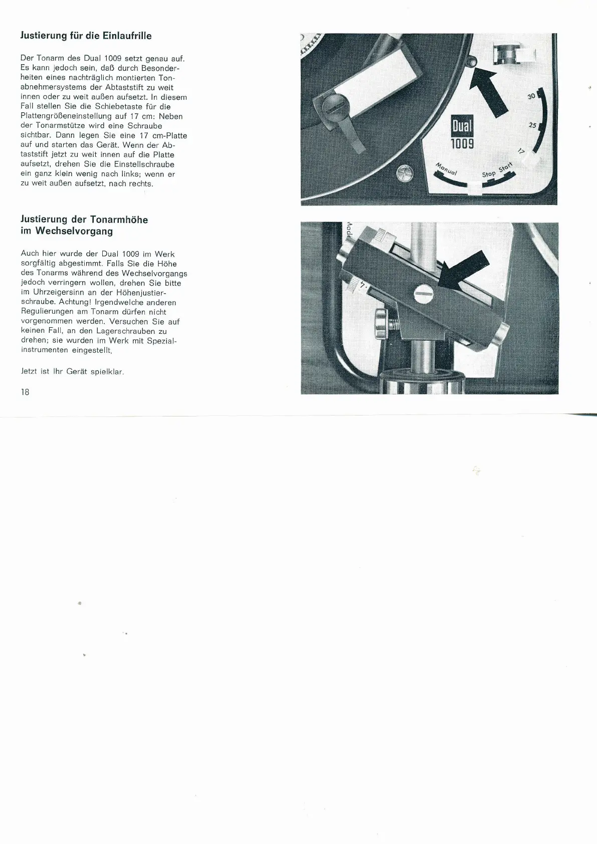 Dual 1009 - Adjustment for Lead-in Groove; Adjustment of Tonearm Height in Cycling