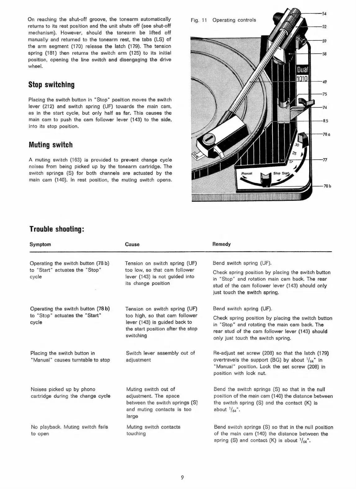 Dual 1010 - Operating the switch button (78 b) to Start actuates the Stop cycle; No playback. Muting switch fails to open; Stop switching; Muting switch
