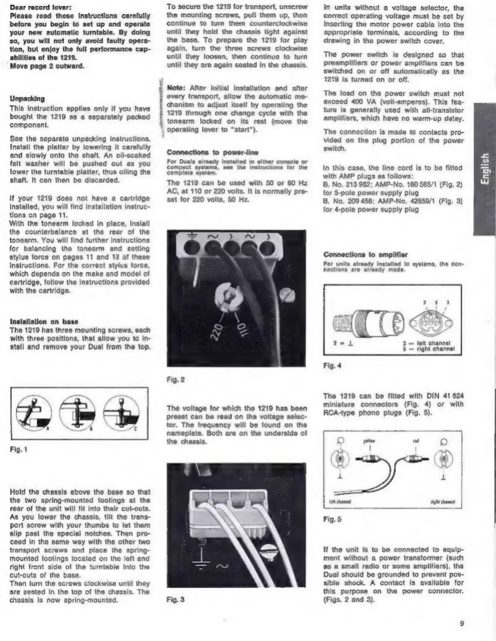 Dual 1219 - Unpacking and Initial Setup; Unpacking the Dual 1219 Turntable; Installing the Turntable on its Base; Electrical Connections