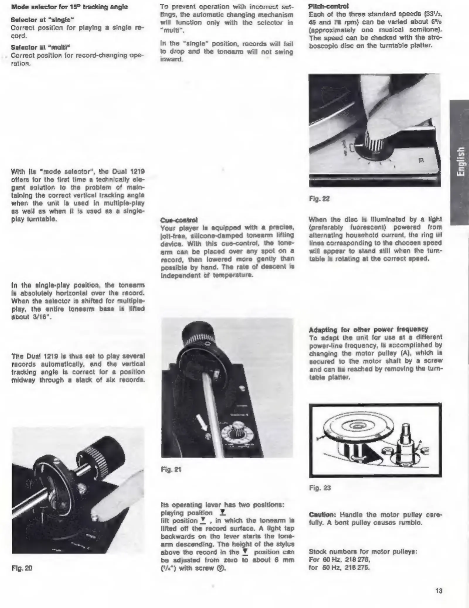 Dual 1219 - Advanced Features and Adaptations; Tracking Angle and Mode Selector Functionality; Pitch Control and Cue Control Operation; Adapting for Different Power Frequencies