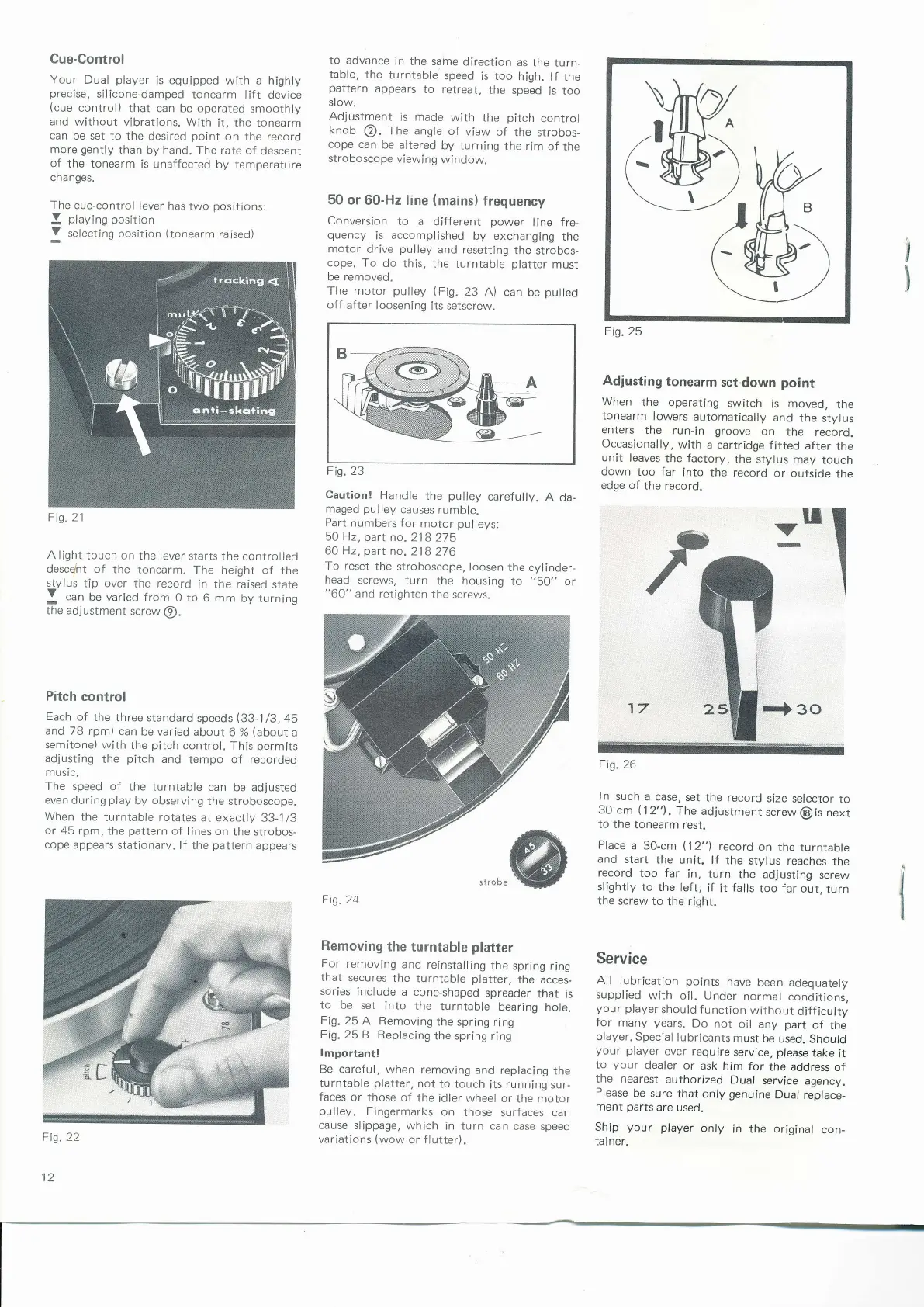 Dual 1229 - Cue-Control Operation; Pitch Control for Speed Adjustment; Frequency Conversion (50;60 Hz); Adjusting Tonearm Set-Down Point