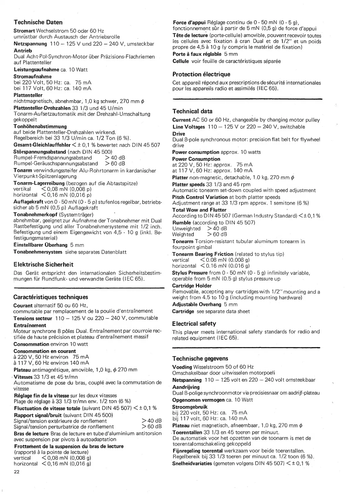 Dual 1237 A - Technische Daten; Caractéristiques Techniques; Protection Électrique; Electrical Safety