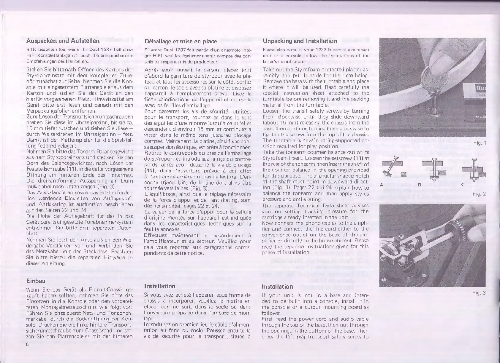 Dual 1237 - Unpacking and Installation; Unpacking the Turntable; Setting up the Turntable
