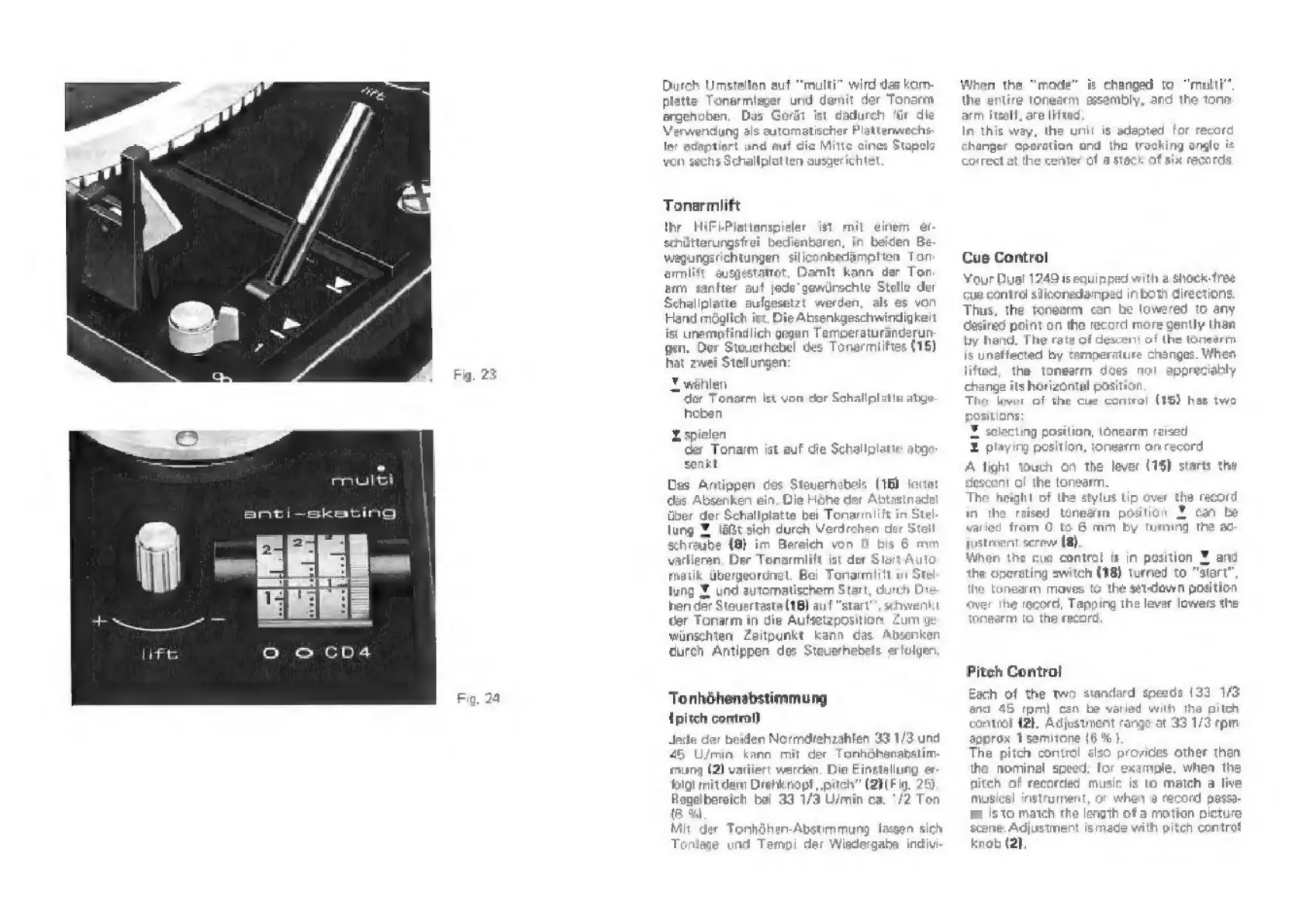 Dual 1249 - Tonearm Lift and Pitch Control; Tonearm Lift Operation; Pitch Control for Speed Adjustment