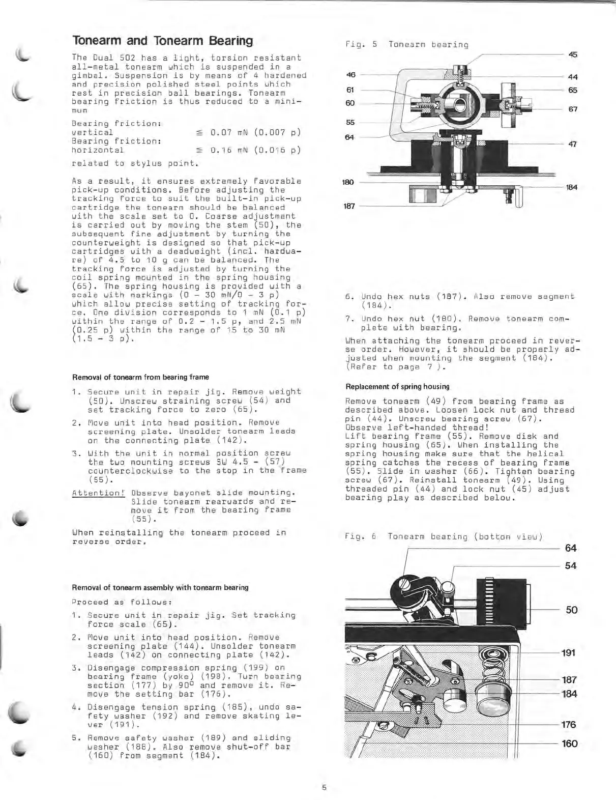 Dual 502 - Tonearm Assembly Procedures; Tonearm Removal from Frame; Tonearm Assembly Removal; Spring Housing Replacement