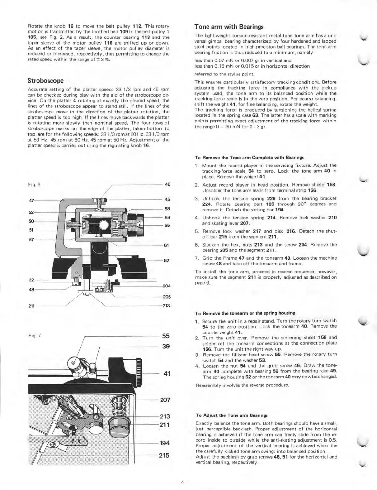 Dual 506 - Tone Arm and Bearings; Tone Arm Removal (Complete); Tone Arm;Spring Housing Removal; Tone Arm Bearing Adjustment