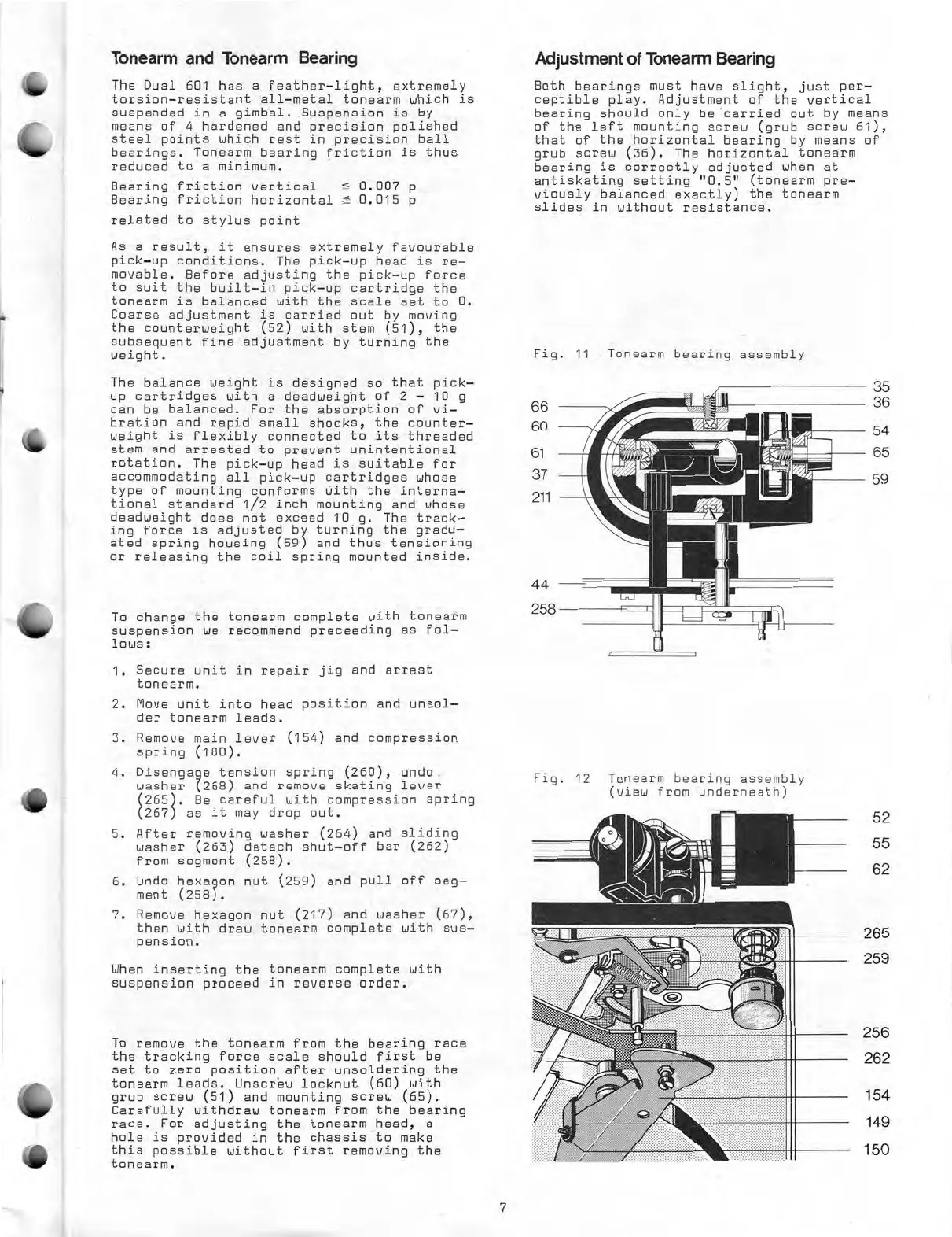 Dual 601 - Tonearm and Tonearm Bearing; Adjustment of Tonearm Bearing