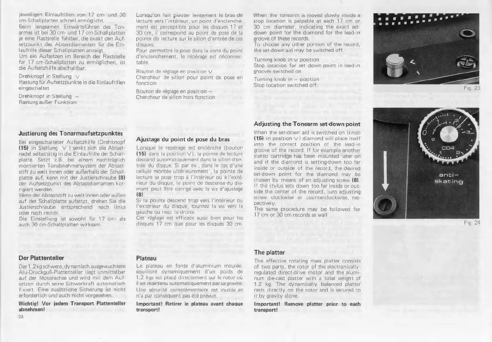 Dual 604 - Tonearm Set-down Point Adjustment; Correcting Tonearm Placement; Platter Description and Handling