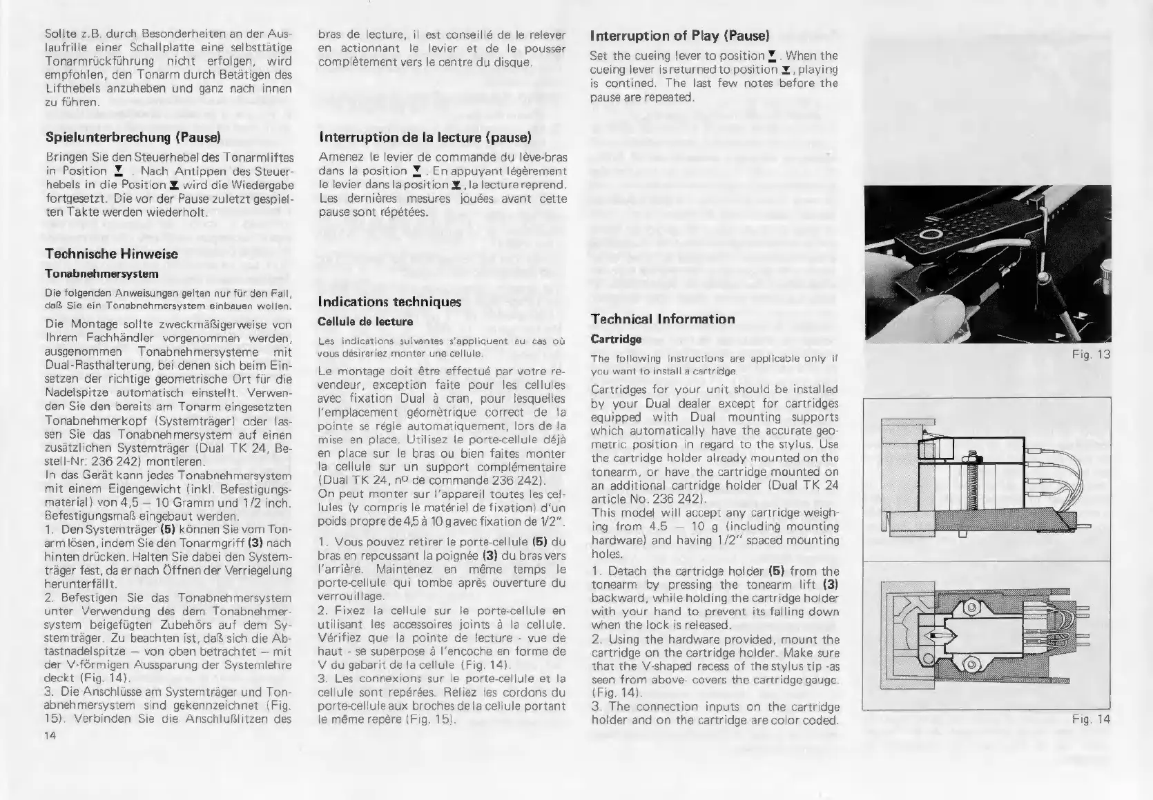 Dual 604 - Interruption of Playback; Pausing and Resuming Play; Cartridge Installation Guide; Detaching and Mounting the Cartridge Holder