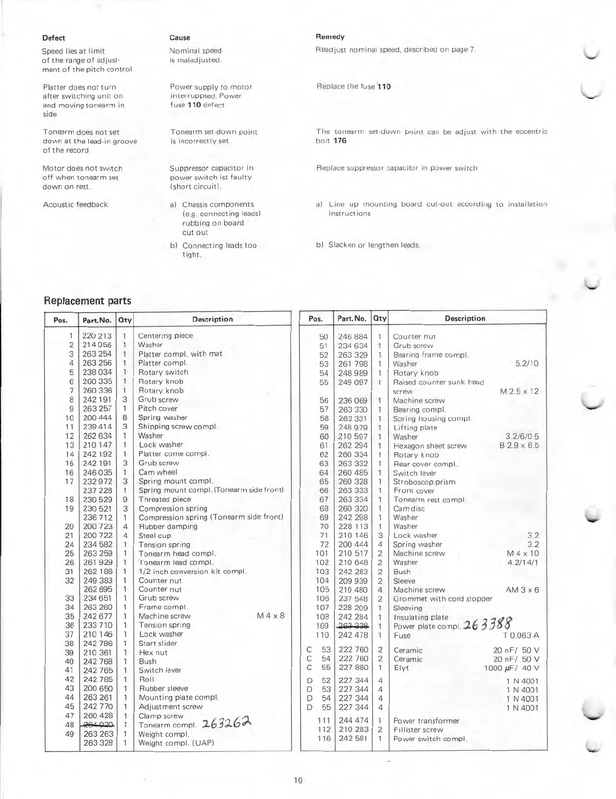 Dual 622 - Replacement Parts List; Component Part Numbers