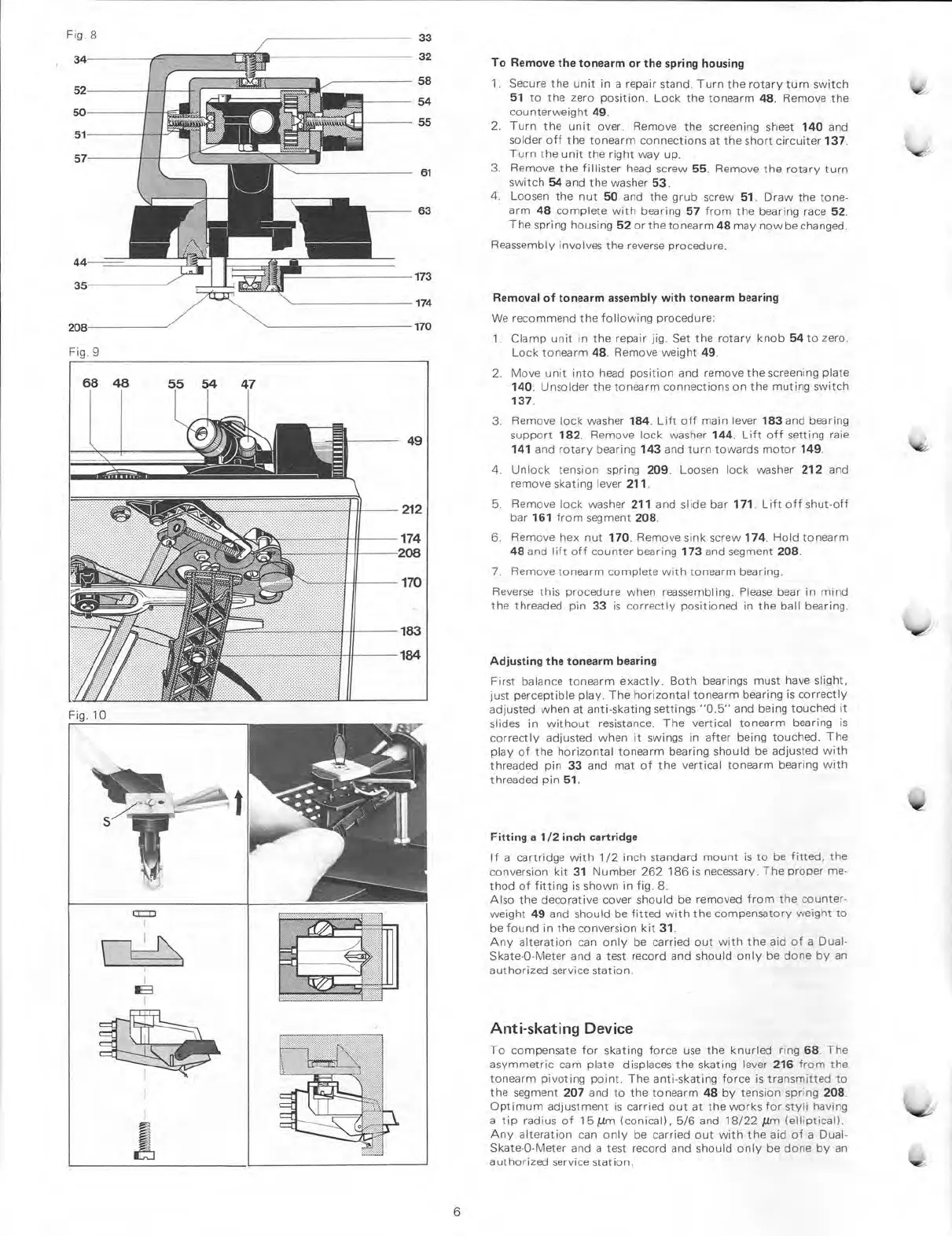 Dual 622 - Tonearm and Suspension System; Tonearm Removal Procedures; Tonearm Bearing Adjustment; 1;2 Inch Cartridge Fitting