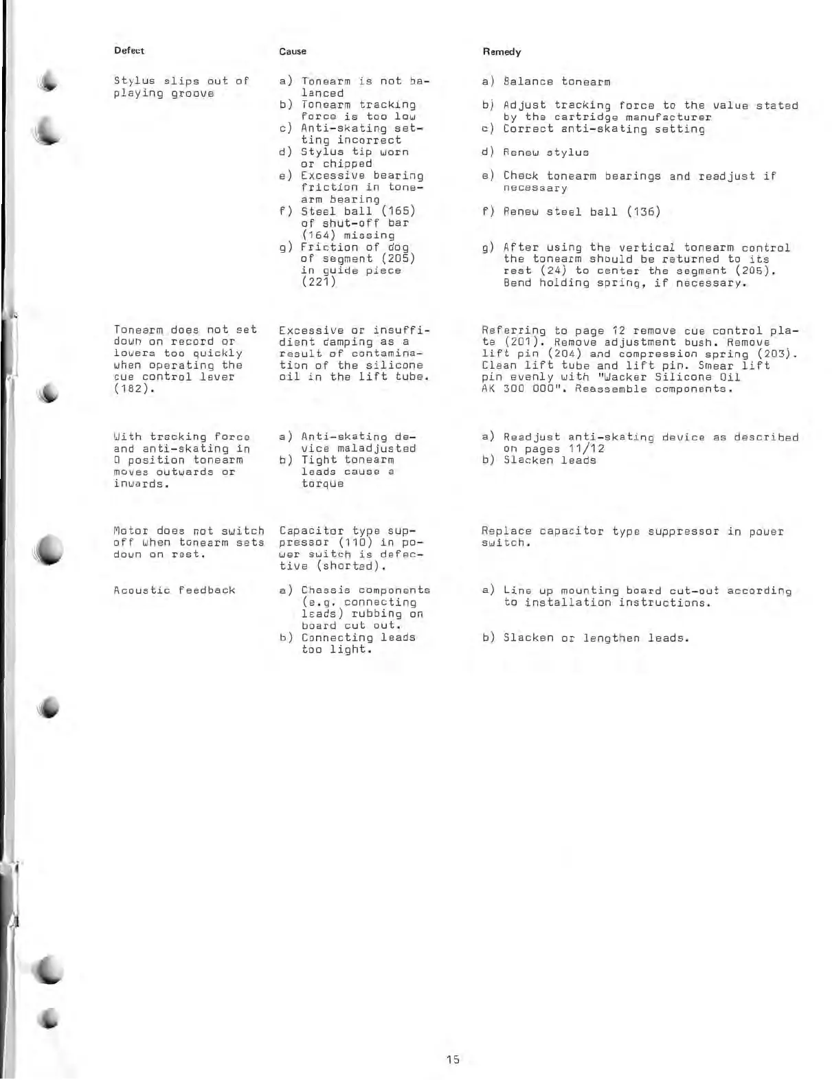 Dual 704 - Troubleshooting: Tonearm and Motor; Tonearm Lowering Issues; Tracking and Anti-skating Problems; Motor Shut-off Failure