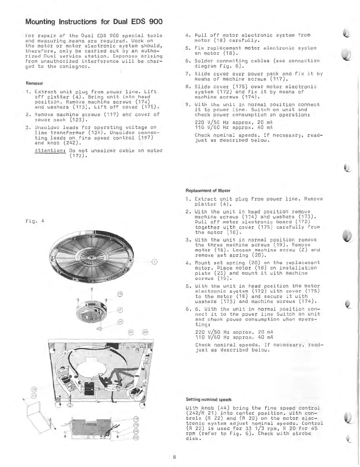 Dual 704 - Mounting Instructions for Dual EDS 900; Component Removal; Motor Replacement; Setting Nominal Speeds