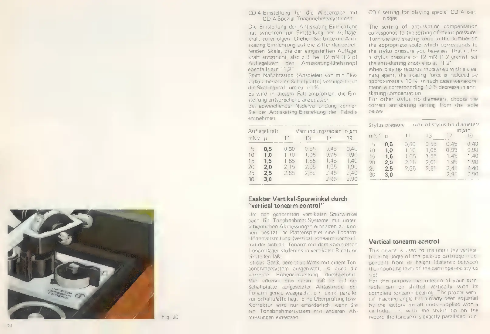 Dual 721 - Tonearm Adjustments; Tonearm Bearing Adjustment; Vertical Tonearm Control; Anti-Skating Device
