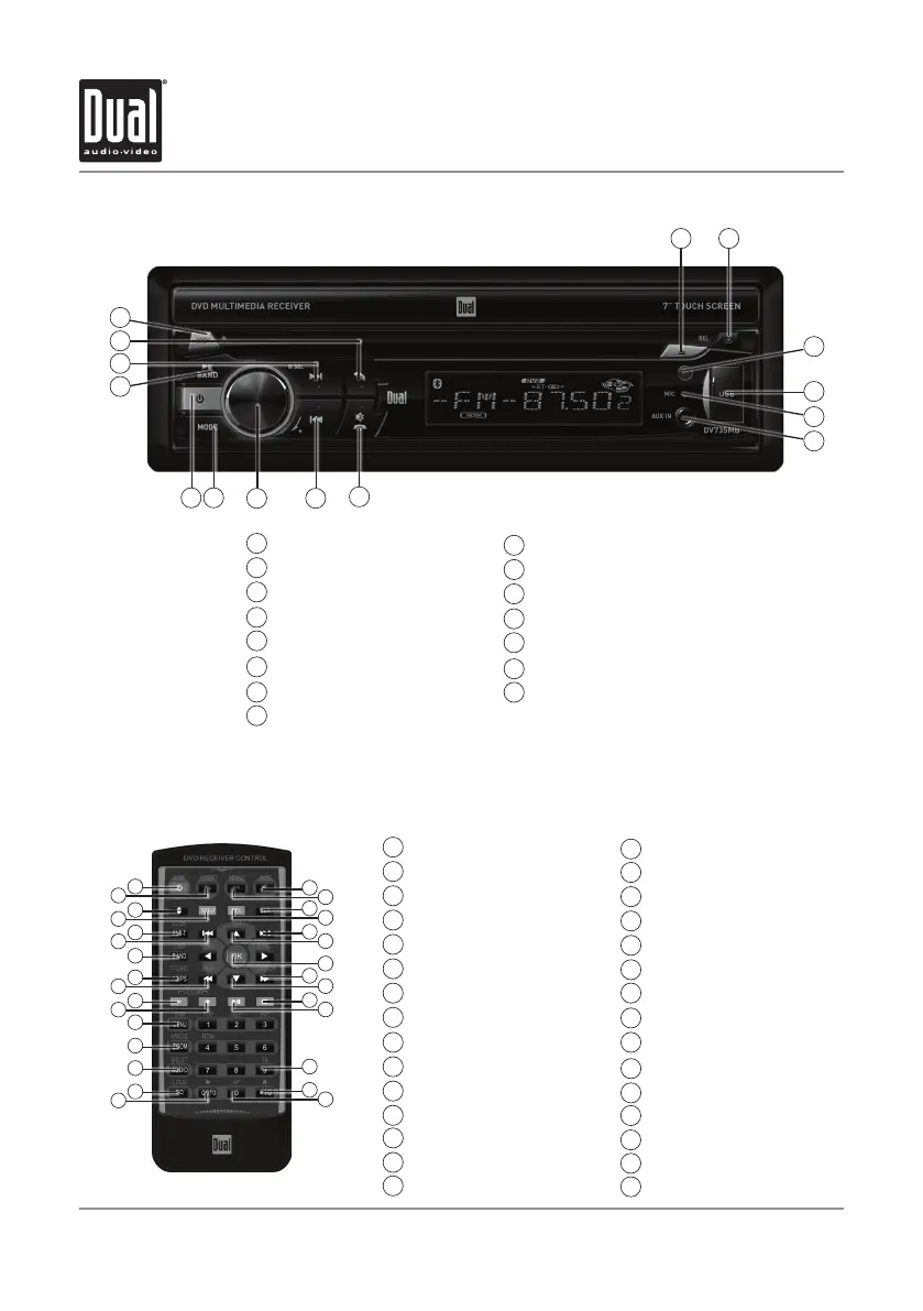 Dual DV735MB - Control Locations; Receiver Front Panel Controls; Remote Control Layout