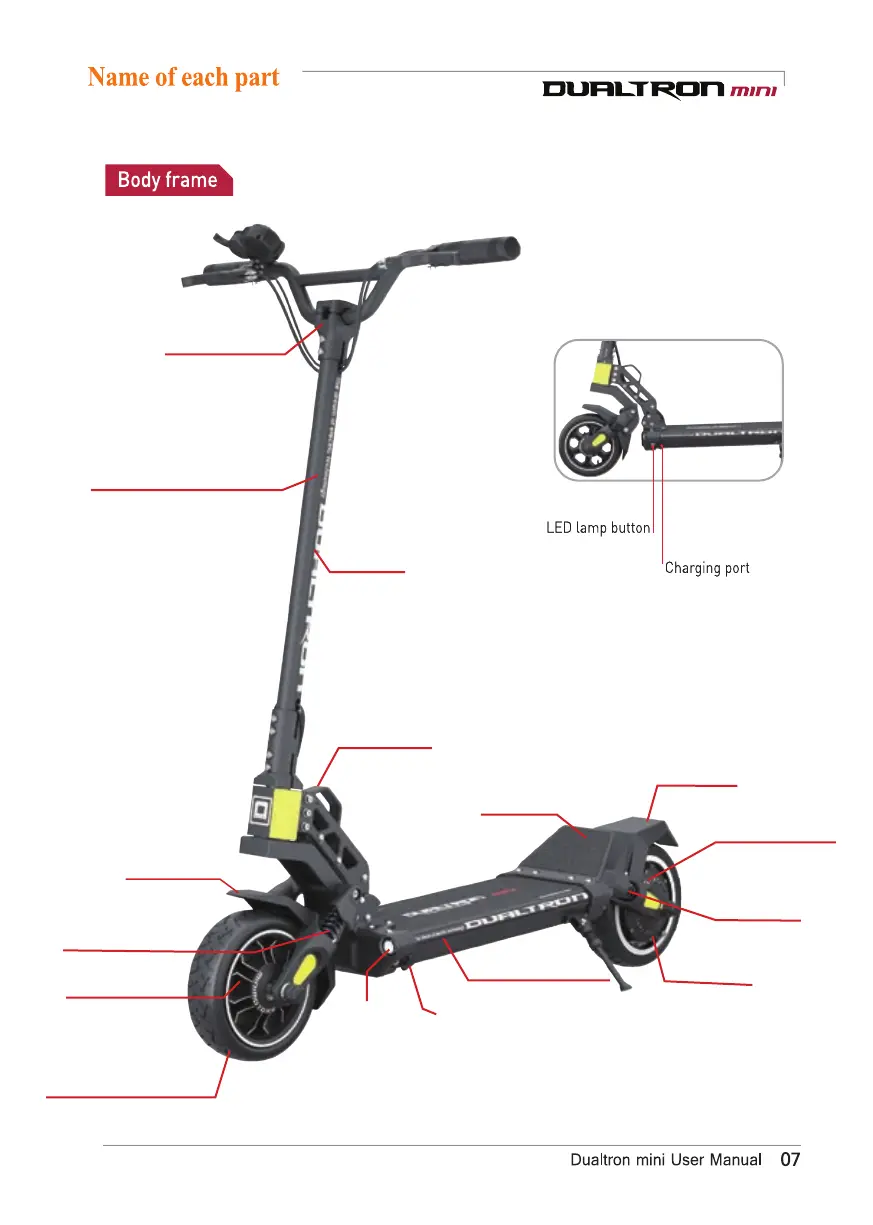Dualtron Mini - Component Identification; Main Body Frame Parts; Handlebar and Front Assembly; Rear and Wheel Assemblies