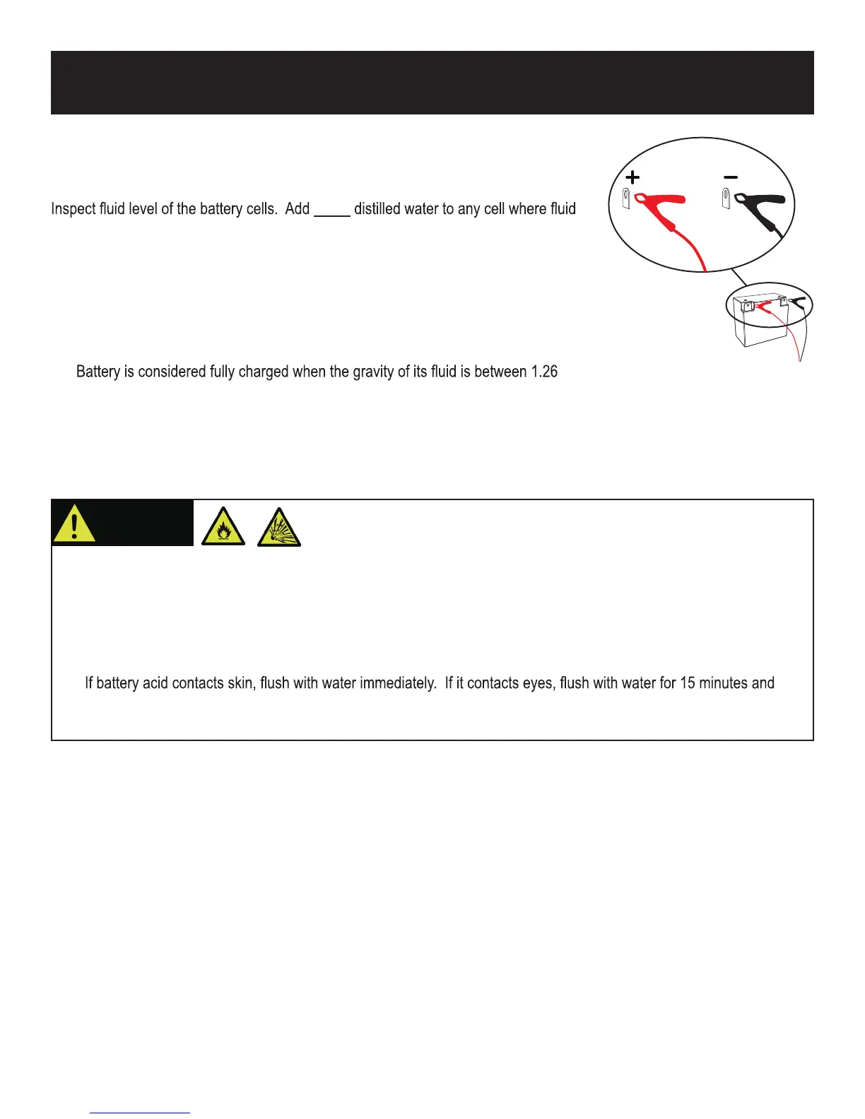 • Do not disconnect battery clamps while charging. Batteries produce explosive gasses. Disconnecting the battery