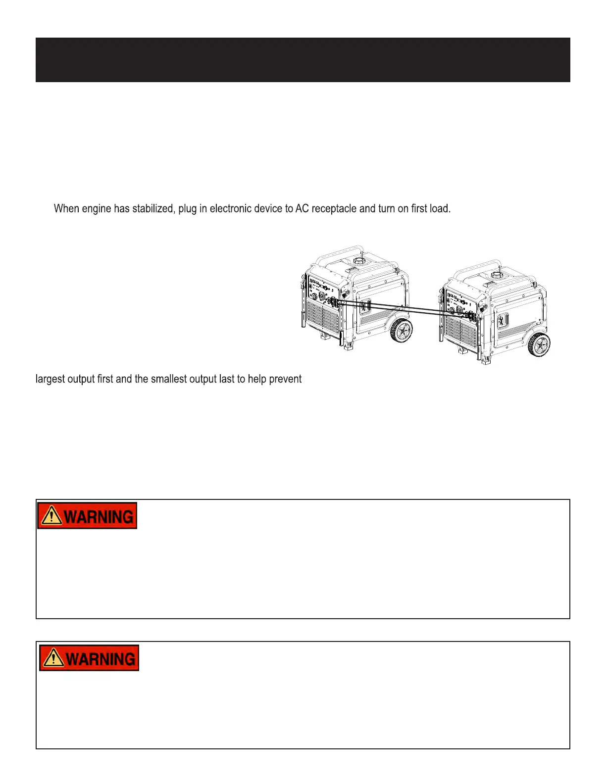 Allow generator output to stabilize (engine and attached devices run evenly) before plugging in the next load.