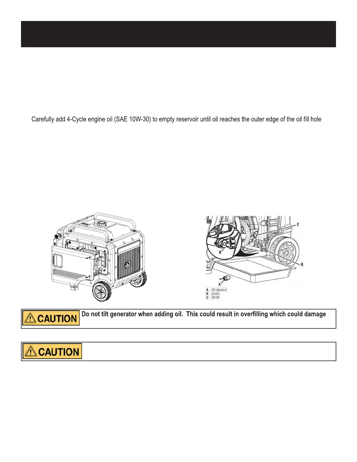 • Place an oil pan underneath the engine. Tilt generator to collect used oil. Allow oil to drain completely.