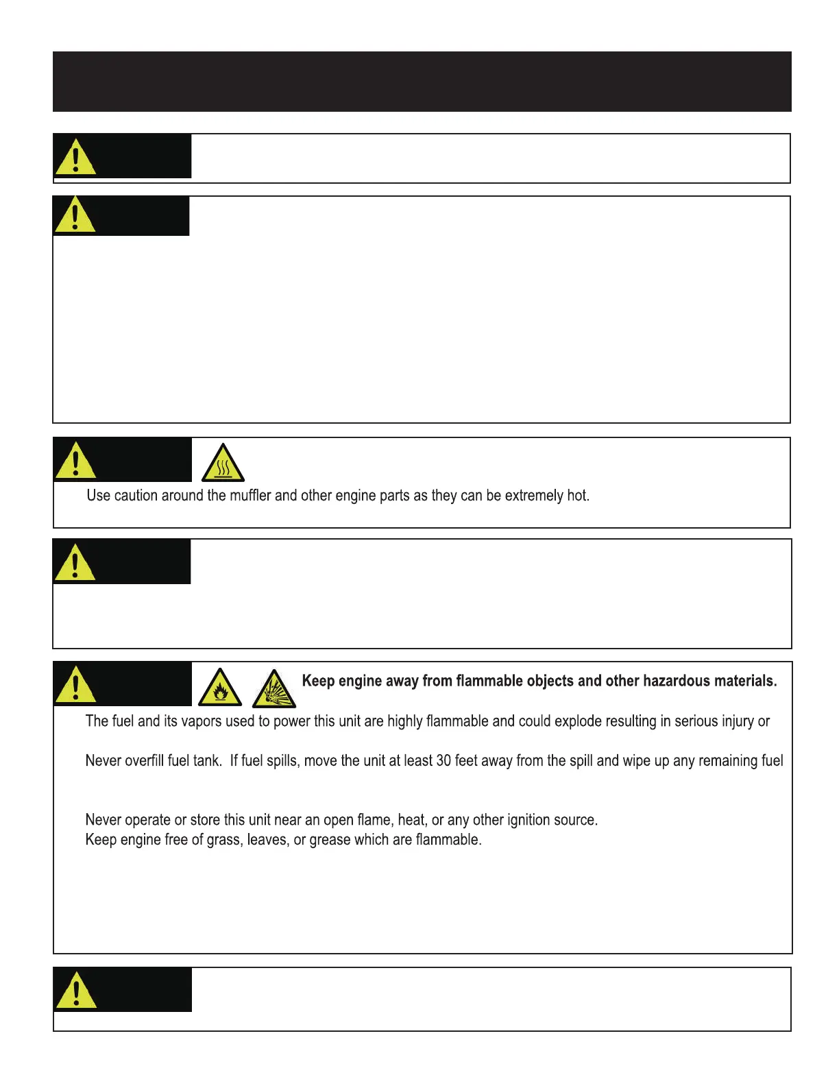 • When adding or draining fuel, unit should be turned off for at least 2 minutes to cool before removing fuel cap. If unit