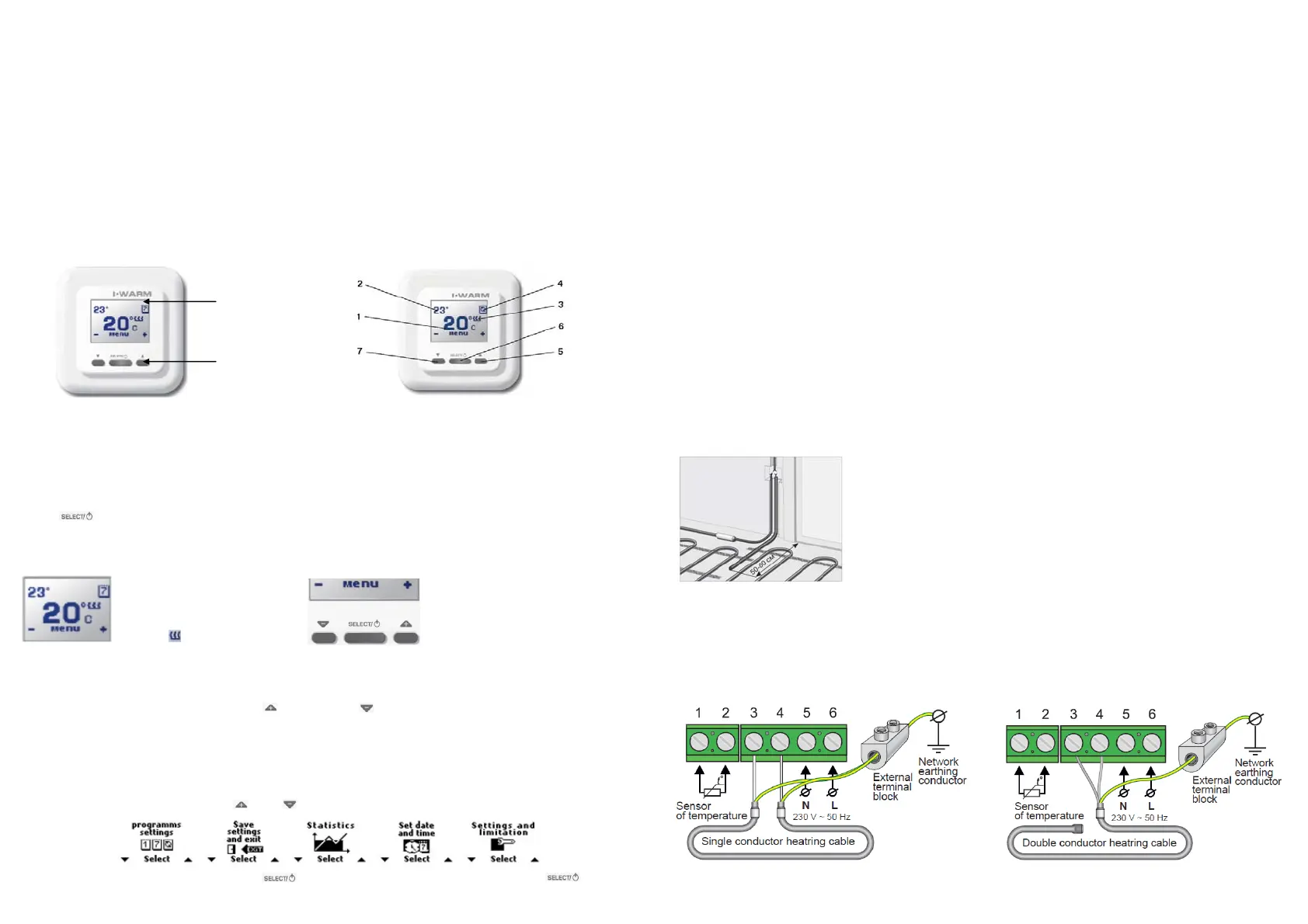 are displayed. The device has self-diagnostics, and will display warning messages. You can set a limit of maximum floor temperature. The device