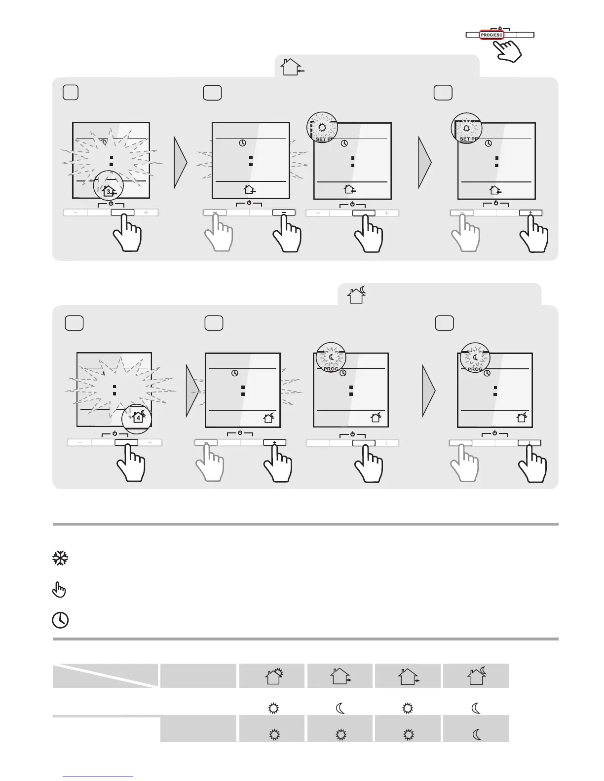 Depending on time and day of the week the thermostat automatically switches the „Comfort“ or „Economy“ floor temperature modus