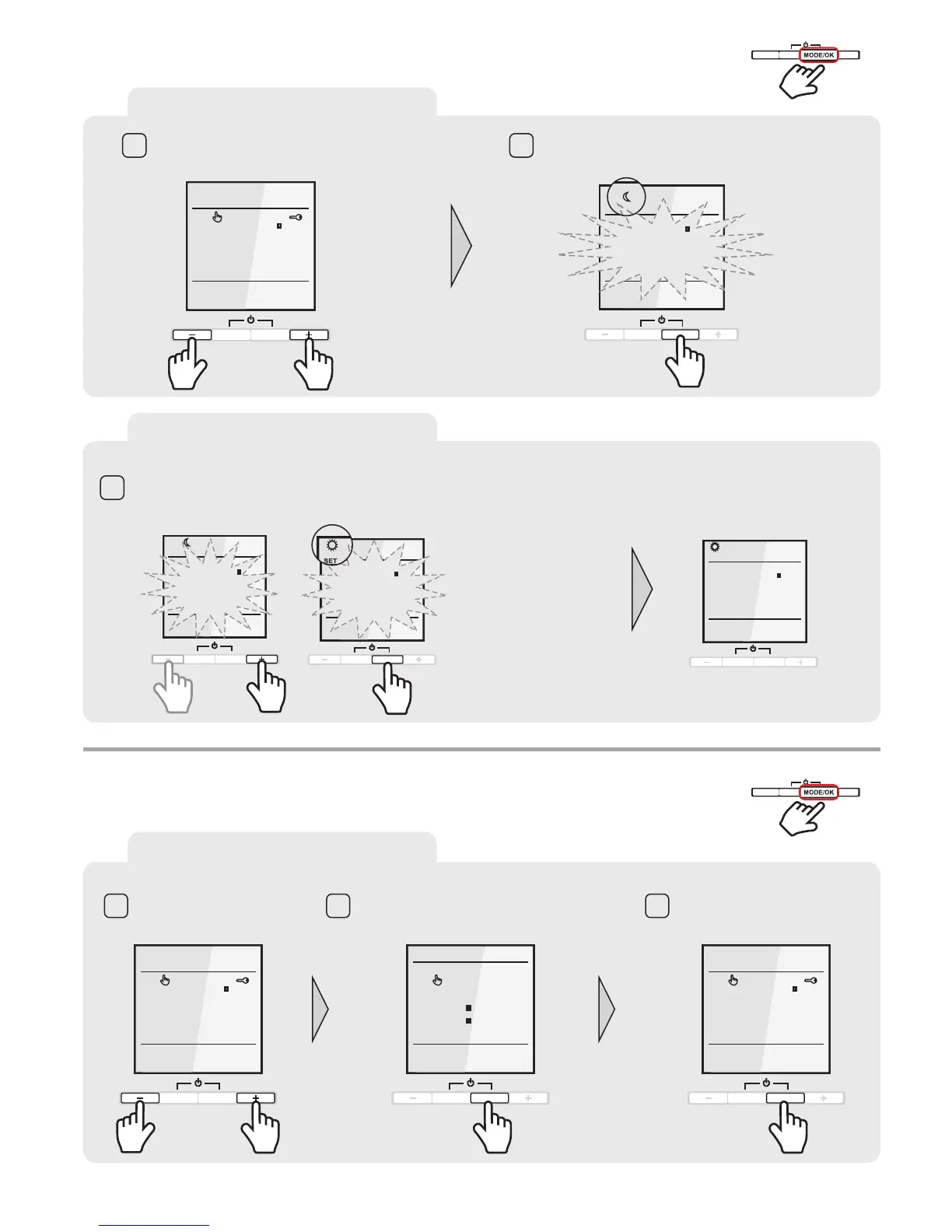 Unlock the thermostat Press and hold the MODE/OK button for 8 seconds.