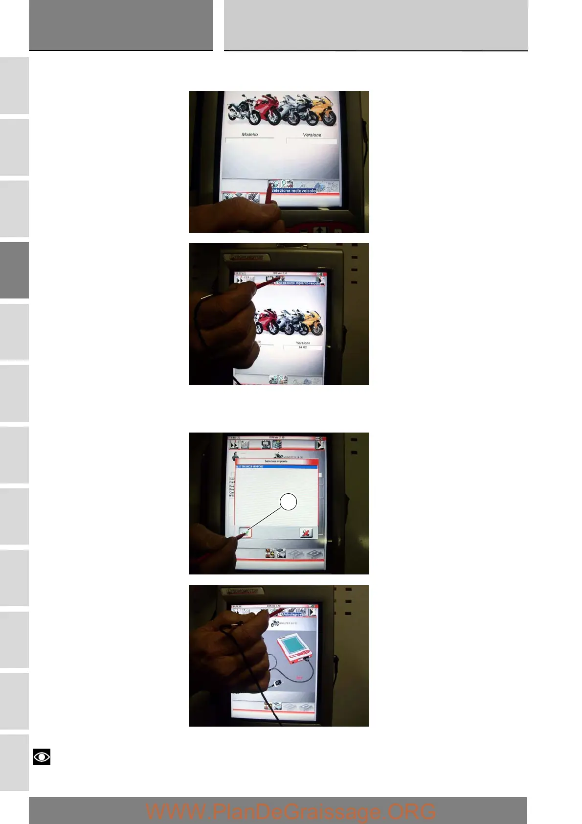 Press the “Select vehicle” icon and, on the next screen, press the “Select motorcycle” icon; select the motorcycle model and