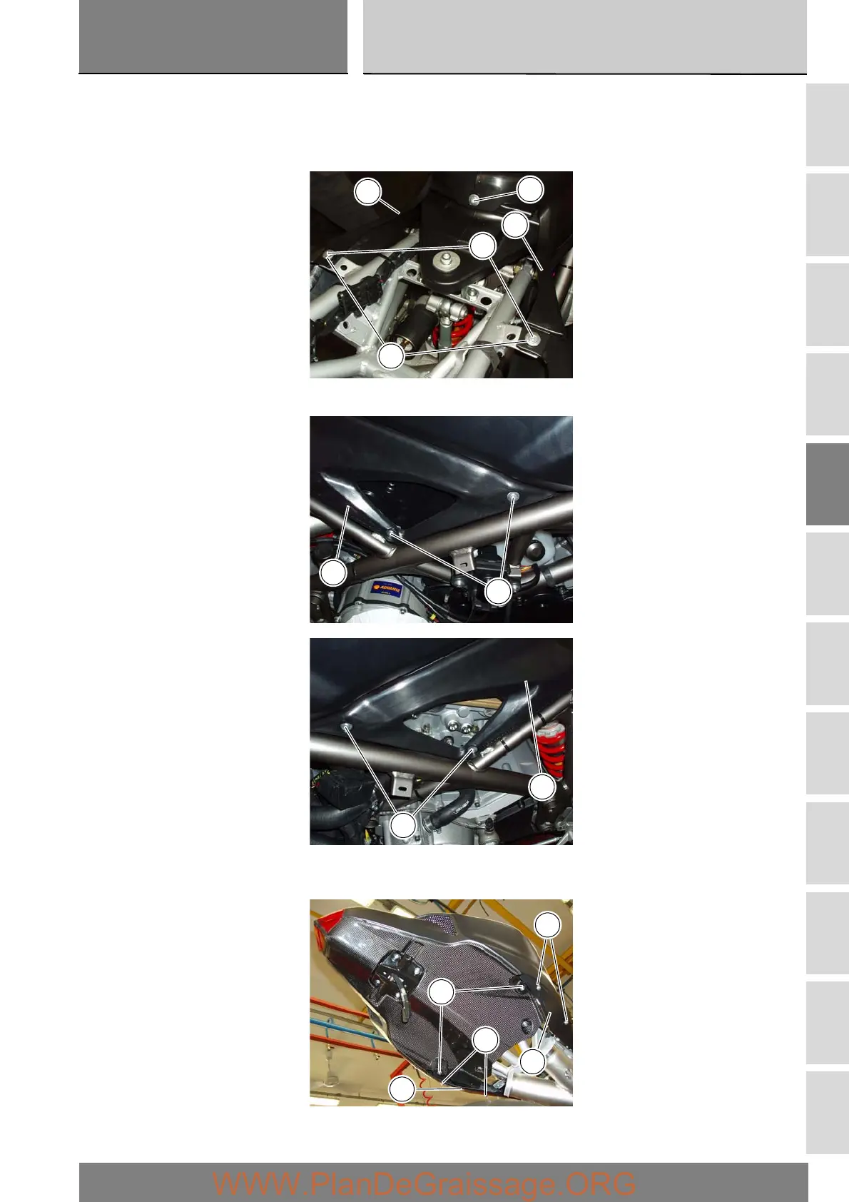 together and to the fuel tank. Fit the washers (3) on the screws (2) and secure the central parts of the side panels to the rear