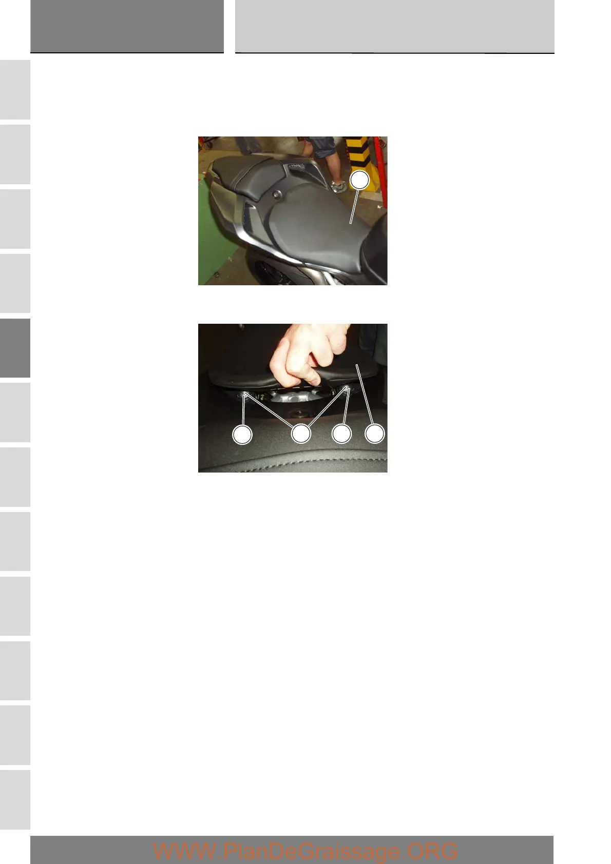 Position the seat (1) on the bike pushing it against the fuel tank so that the front catches engage the corresponding locations on