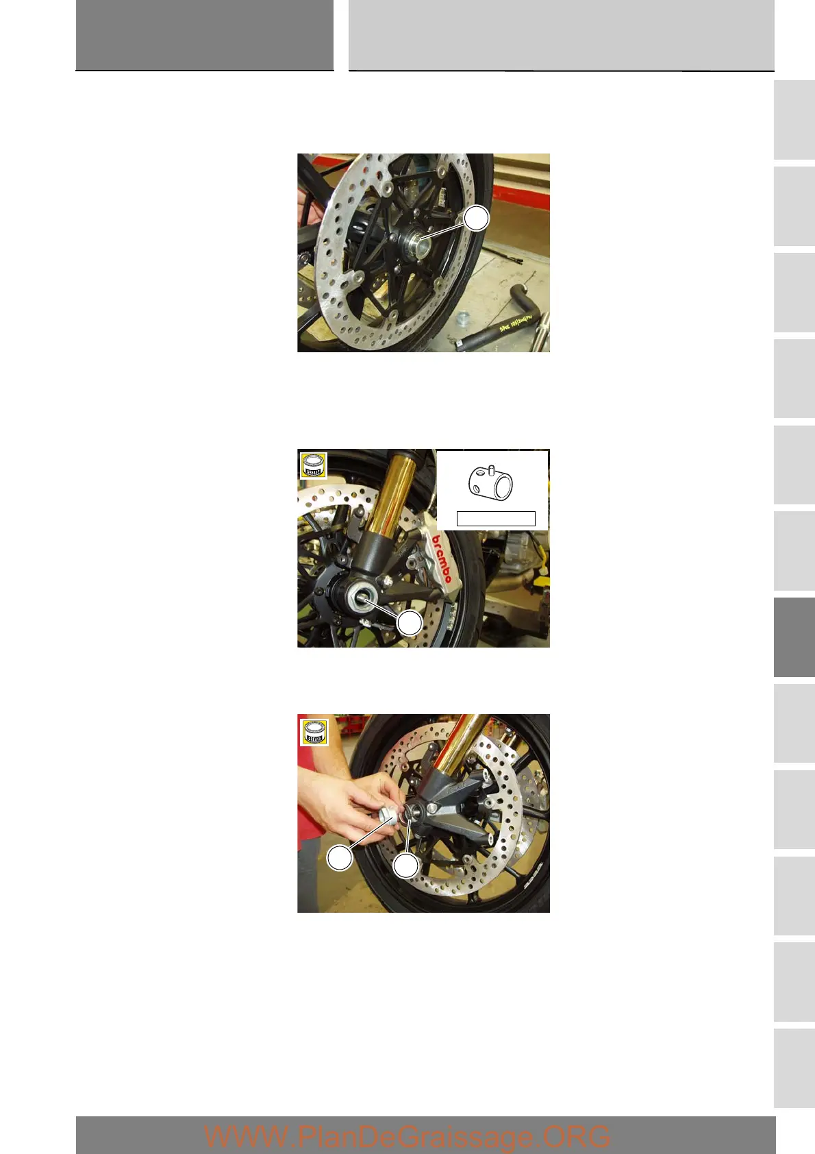 Grease the thread and the underside of the head of the axle lock nut (1), then screw it on.