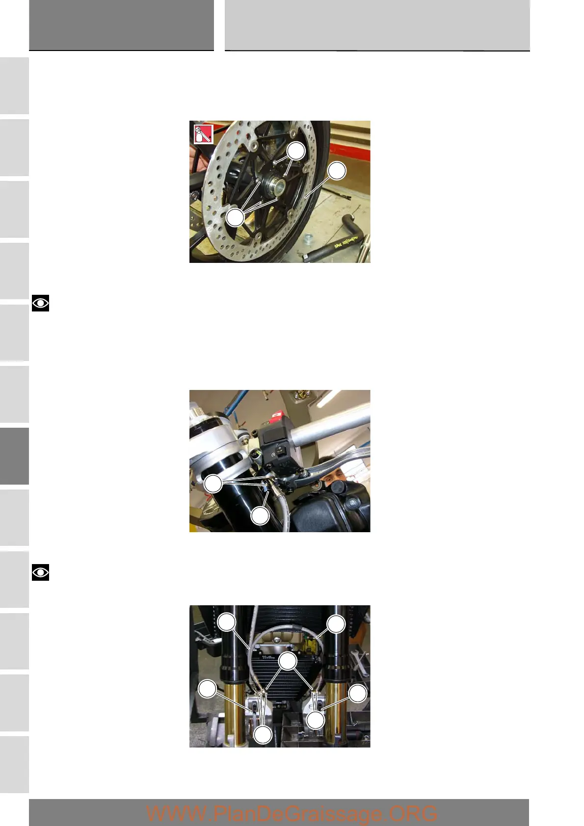 Reconnect the hoses (3) and (15) to the front brake calipers (10) and (11) and tighten the screws (7) to their specified torque