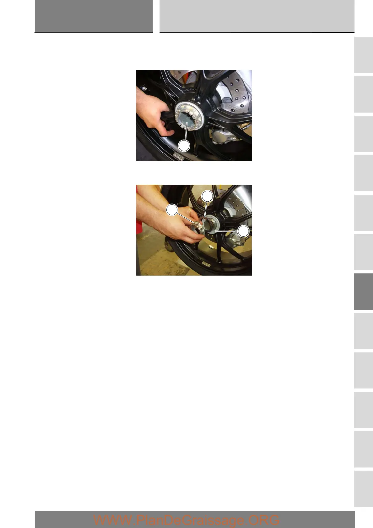 Fully unscrew the wheel nut (1), then slide of the washer (2) and the bush (3).