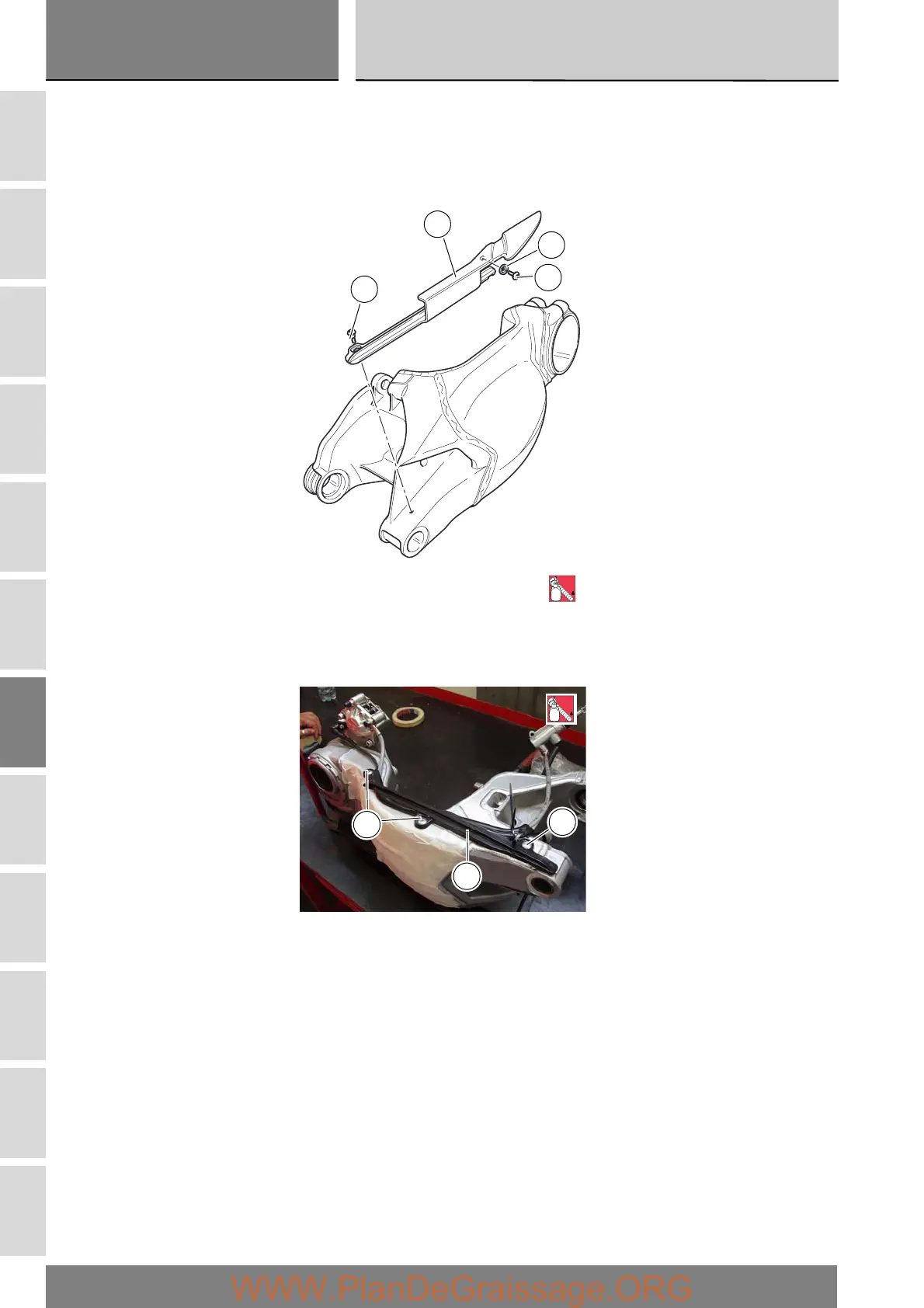 Refit the rear brake hose and speed sensor to the swingarm (4), securing them with the lower chain slider (8) and tightening the