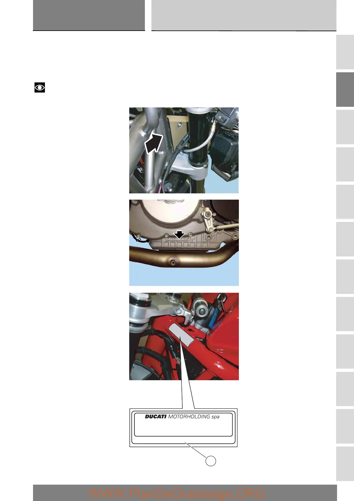 Each Ducati motorcycle has two identification numbers - the frame number and the engine number - and an EC nameplate (A)