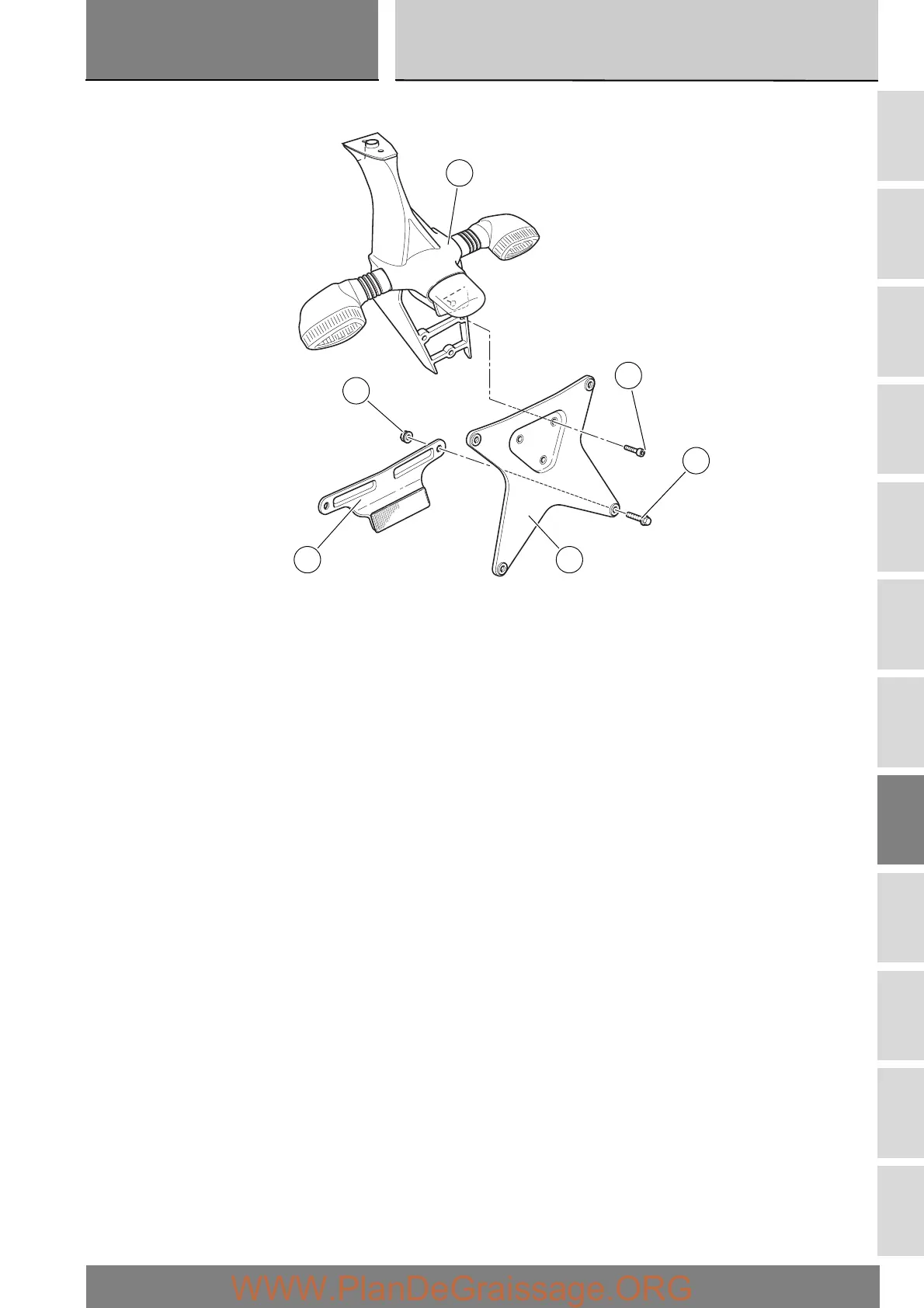 Unscrew the bolts (11) and (14) to remove the number plate support (7) from the number plate (1) and from the bracket (9).