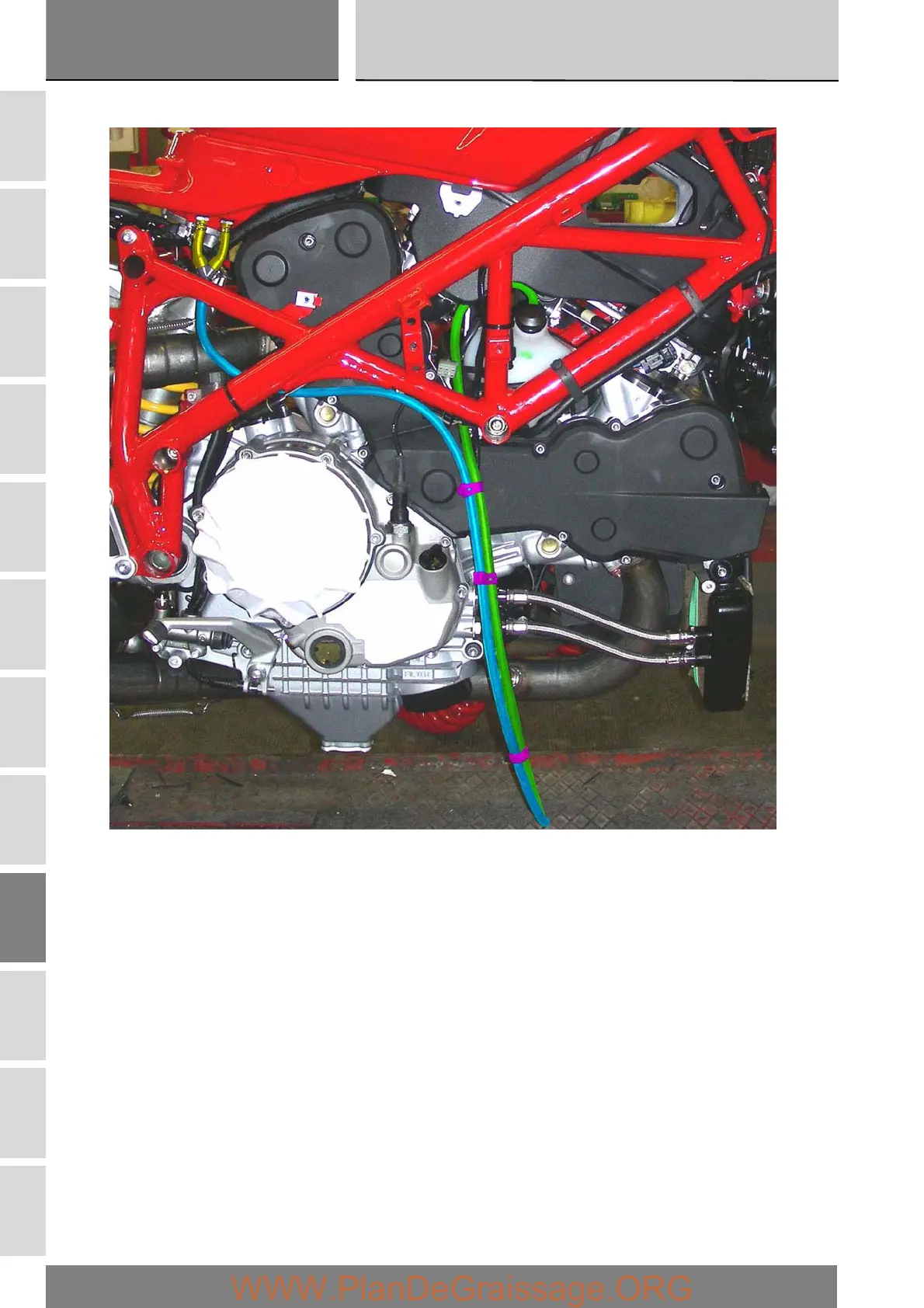 Positioning of the fuel tank breather and drain hoses and the water overflow hose and expansion tank.