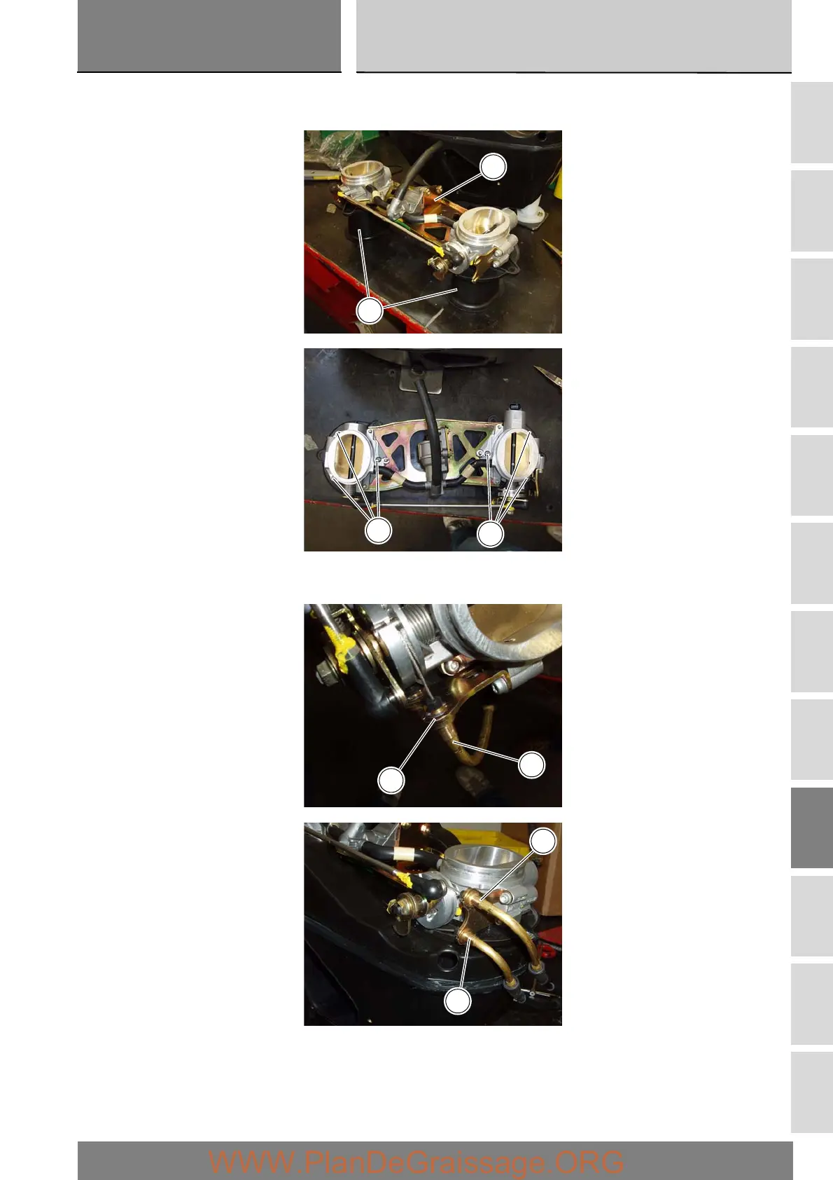 cable (Q) in the throttle body plate, as shown in the figure. Secure the throttle cables with two circlips (R).